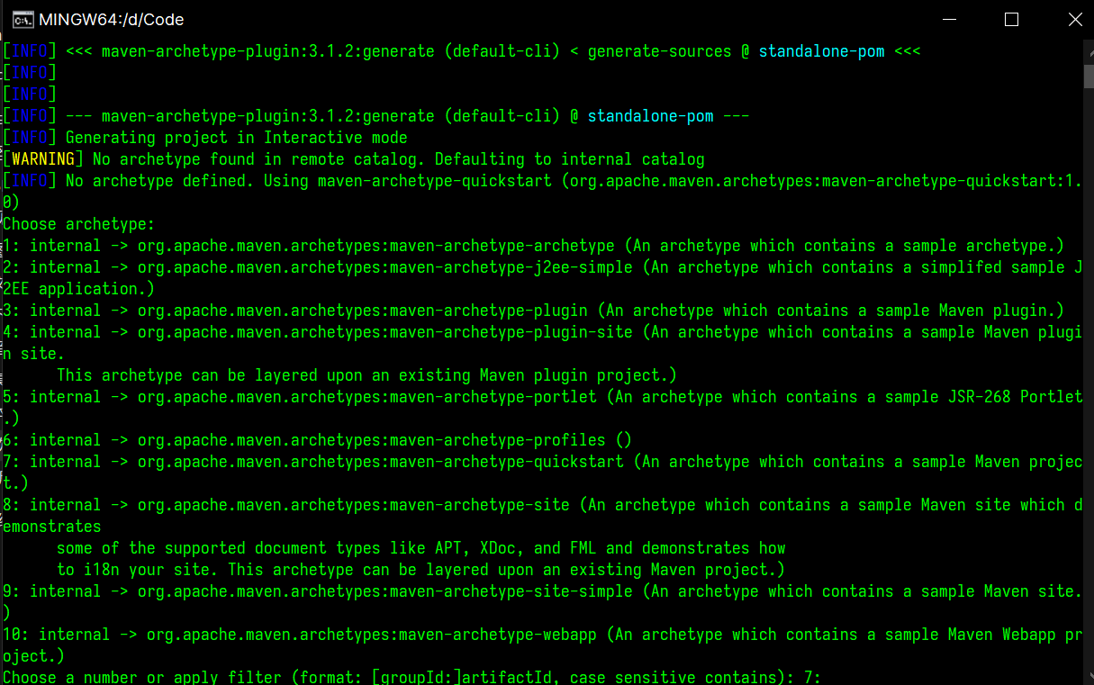 mvn archetype:generate- 然后会有很长的输出,有多种可用的 Archetype 供你选择,选择你所需要的,然后输入对应编号即可;