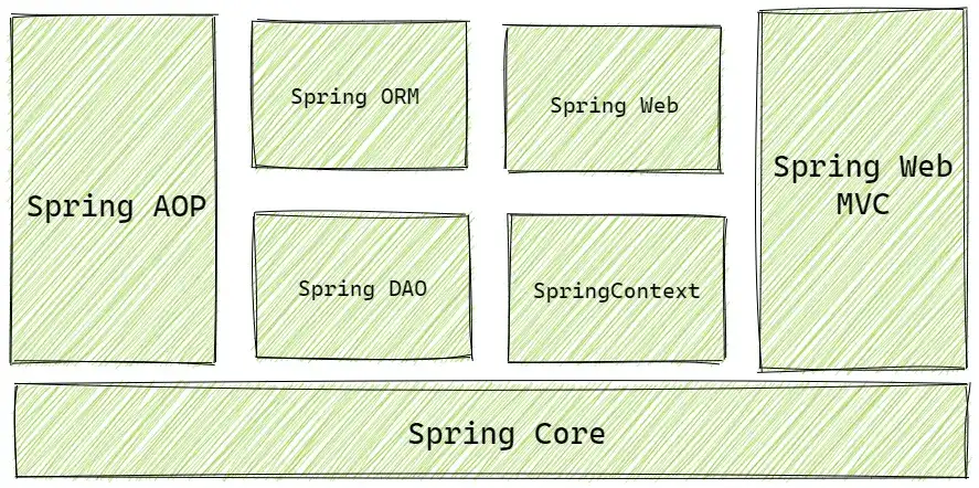 Spring 是一个分层架构,主要由如下 7 大模块所构成。Spring 模块位于核心容器,定义了创建、配置和管理 Bean 的方式。