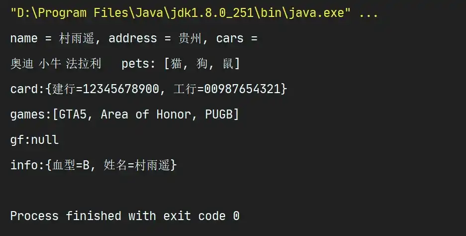 System.out.println("name = " + name + ", address = " + address.getAddress() + ", cars = ");
