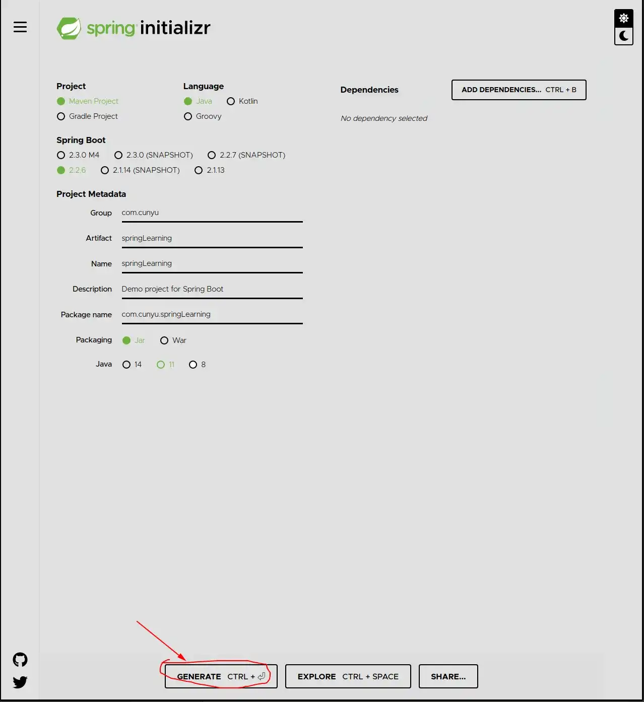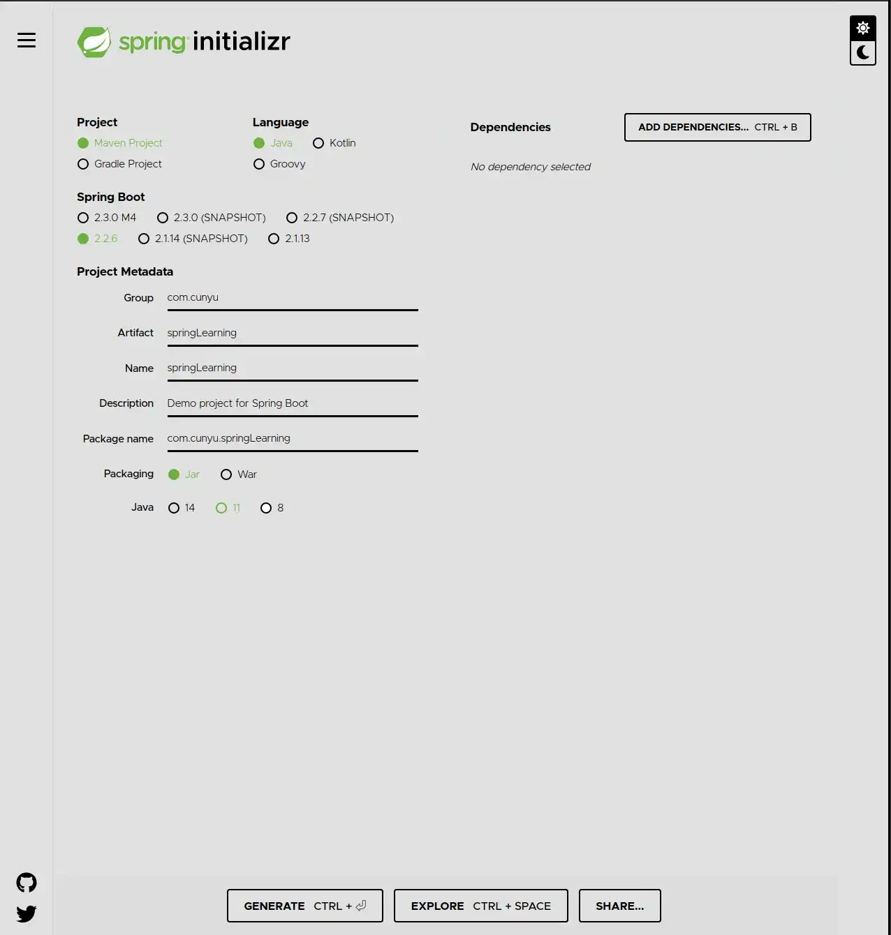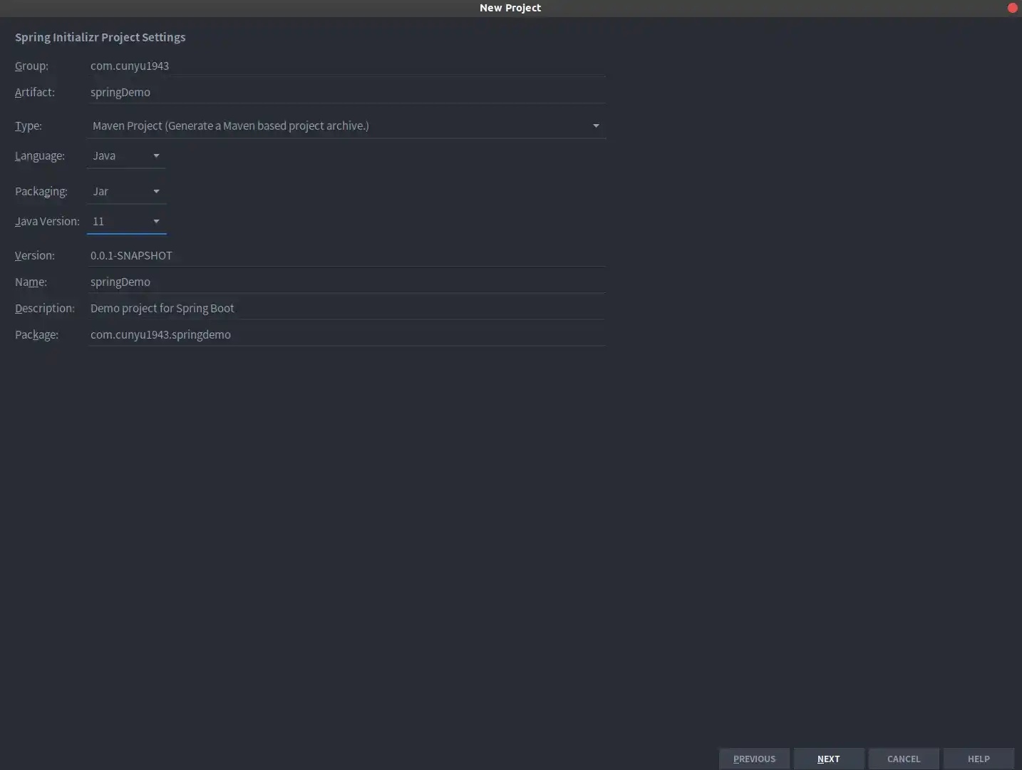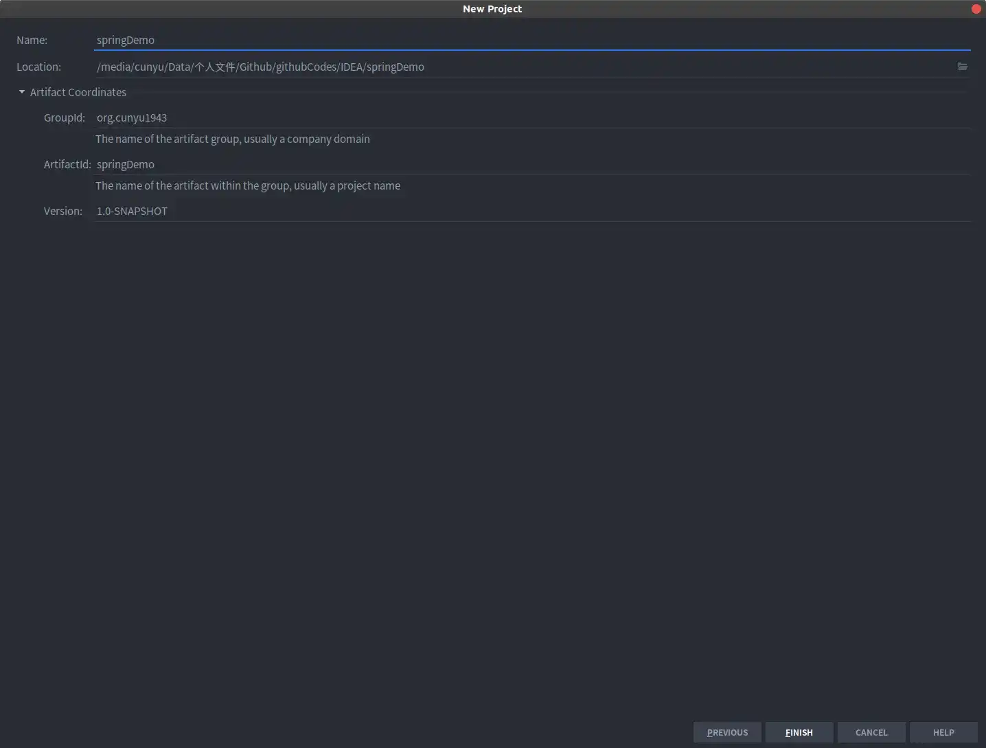 创建时输入的 Project Metadata 部分,即 Maven 项目的基本元素,包括 groupId、artifactId、version、name、description 等;