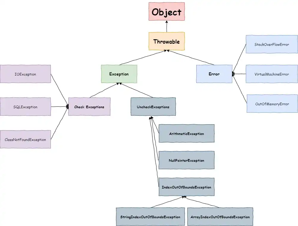 从结构图可以看出,所有异常均继承自 Throwable 类,它有两个重要的子类:Exception 和 Error ,各自又包含大量子类。