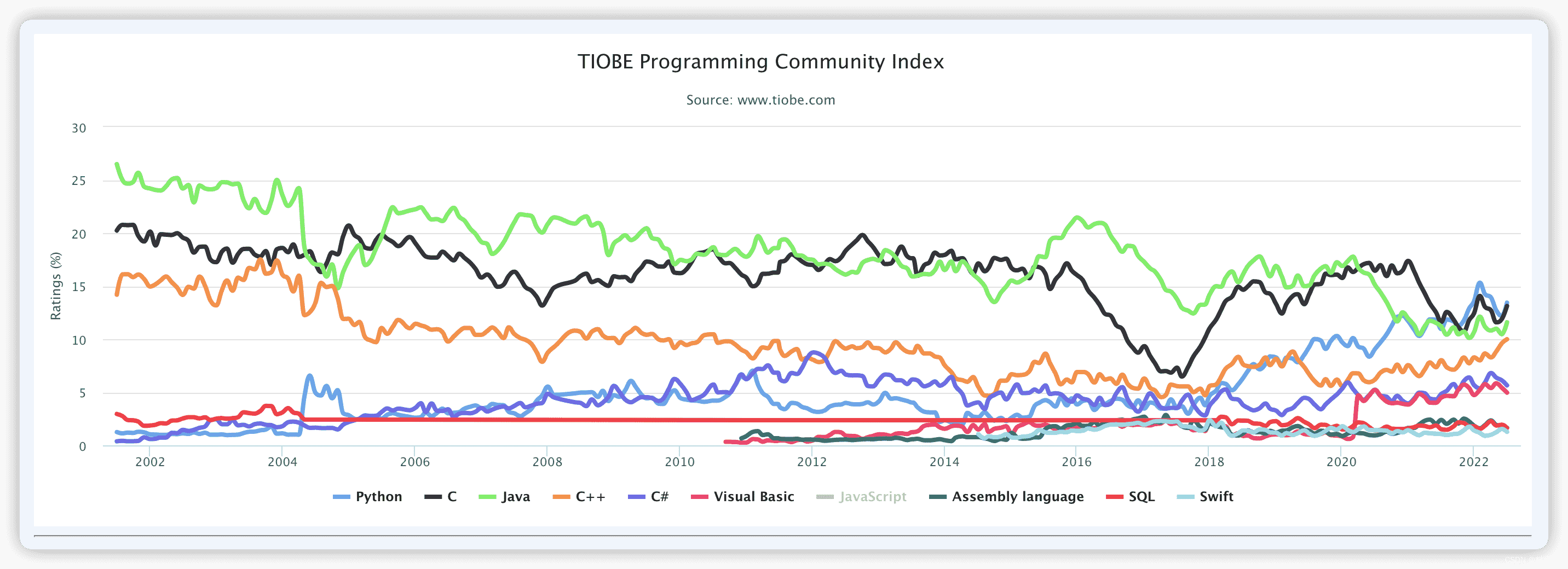 以下是截止 2022 年 7 月 TIOBE 统计的编程语言排行榜,可以看到 Java 处于前三的位置。而从历年编程语言所占市场份额趋势图也可以看出,Java 虽然没有一直独占鳌头,但绝大数时间都是占据领先地位。