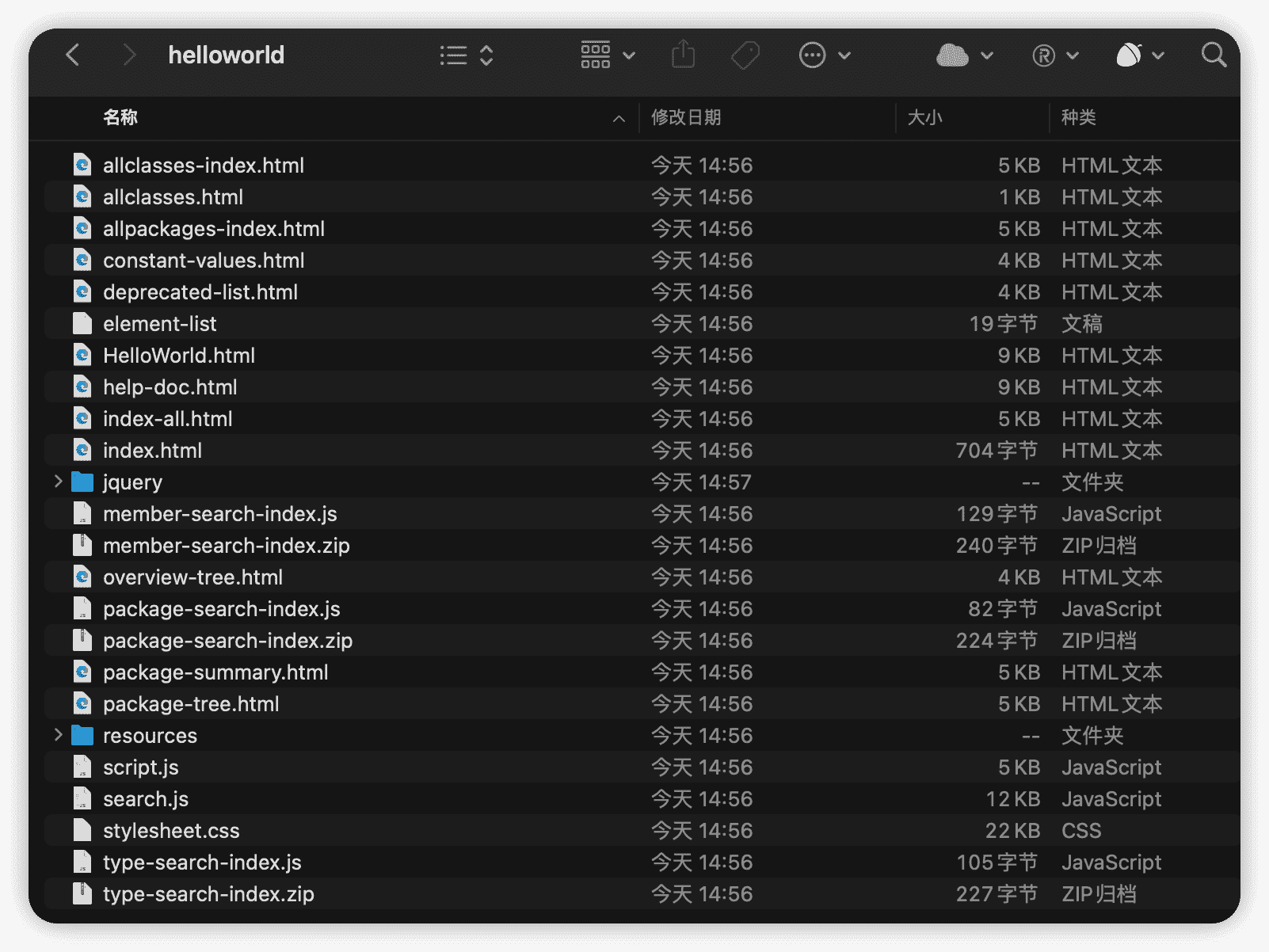 生成的文件列表详情见下图,打开其中的 index.html 就可以查看提取的文档注释。