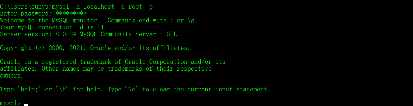 mysql -h localhost -u root -p