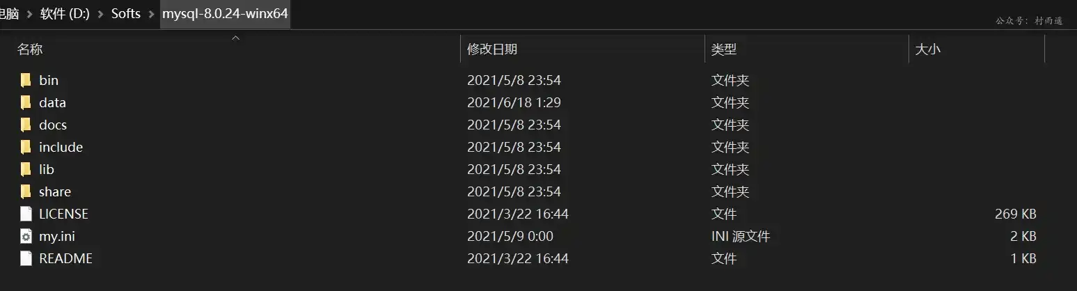 将下载后的压缩包接要到我们需要安装 MySQL 的路径,以下以我的安装路径 D:\Softs\mysql-8.0.24-winx64
