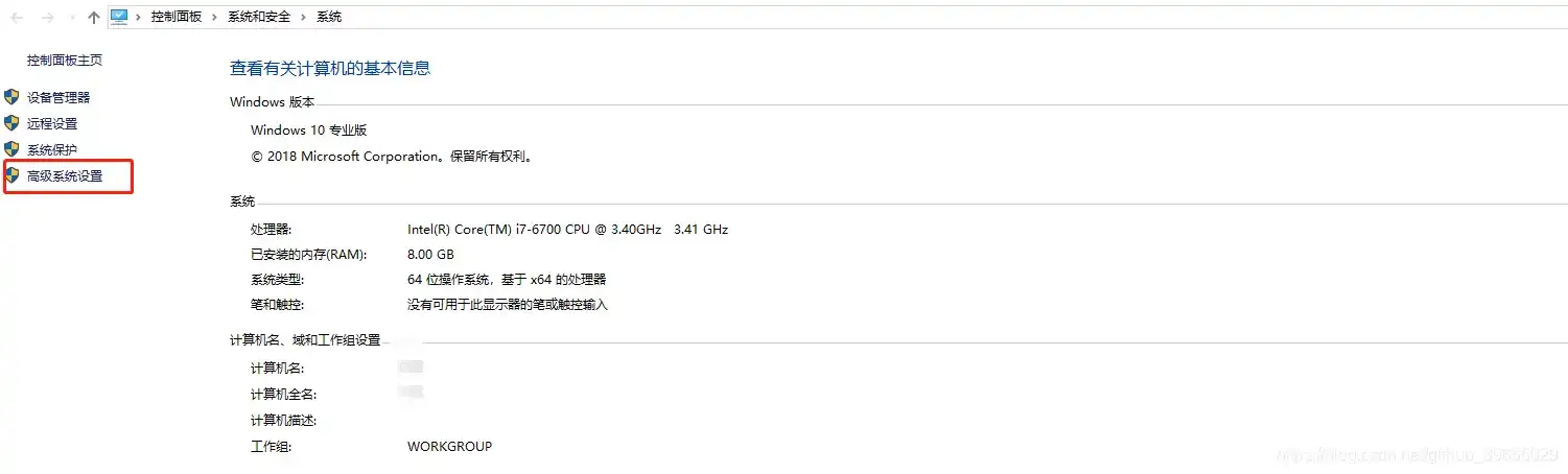 打开控制面板->系统与安全->系统,进入高级系统设置,如下图所示;