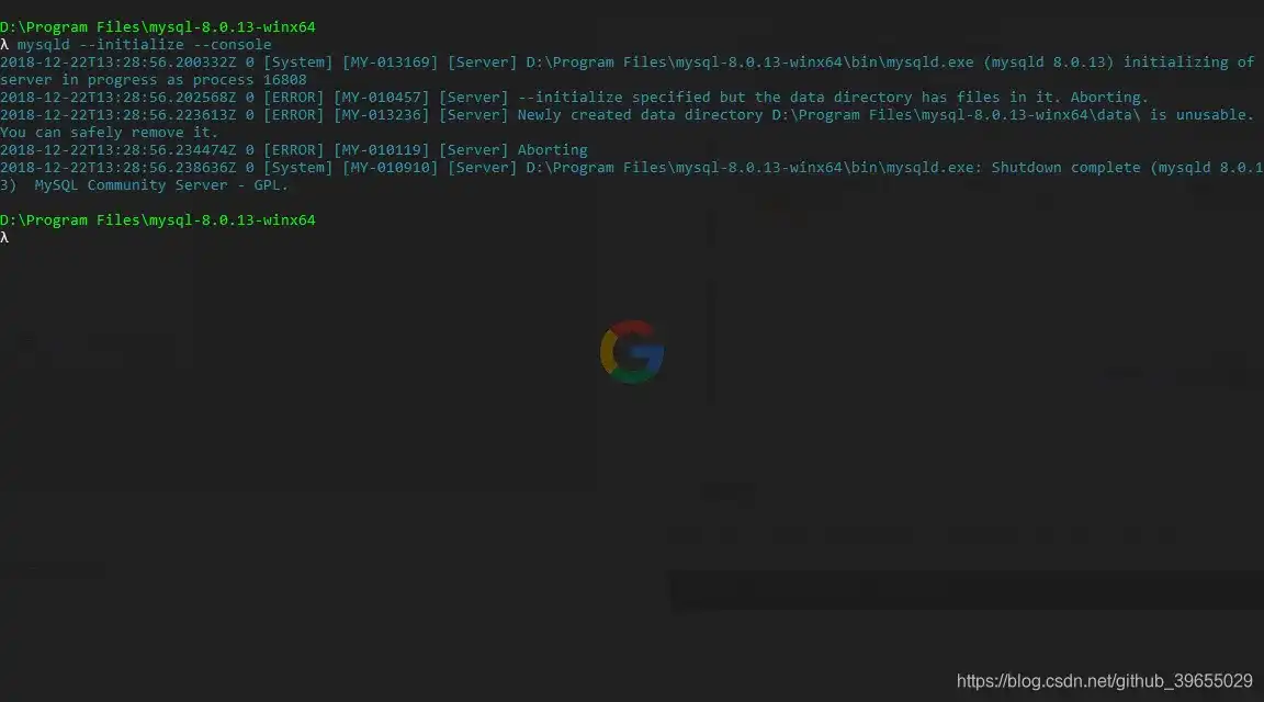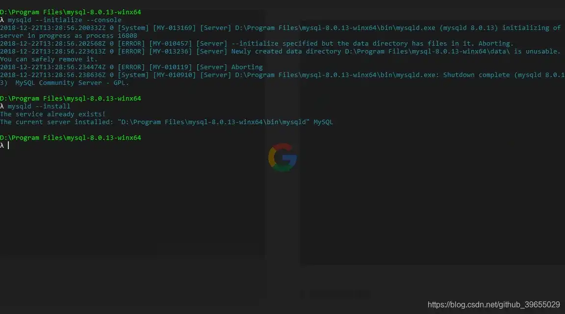 控制台进入 MySQL 解压后的路径,然后以管理员身份执行如下命令;