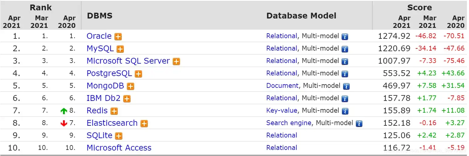 上图是截至 2021 年 4 月数据库使用率排行榜前 10 榜单,可以看到主要有 Oracle、MySQL、SQL Server、Redis、MongoDB、PostgreSQL、Elasticsearch,Db2 等数据库。而我们之所以选择 MySQL,主要有如下两个原因:
