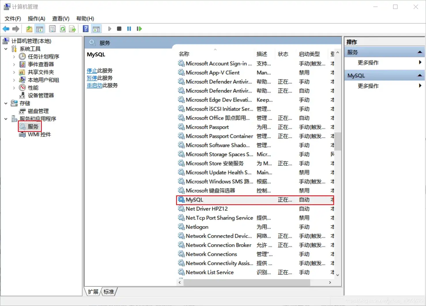 ,进入计算机管理界面,然后打开 服务和应用程序 -> 服务,找到 MySQL