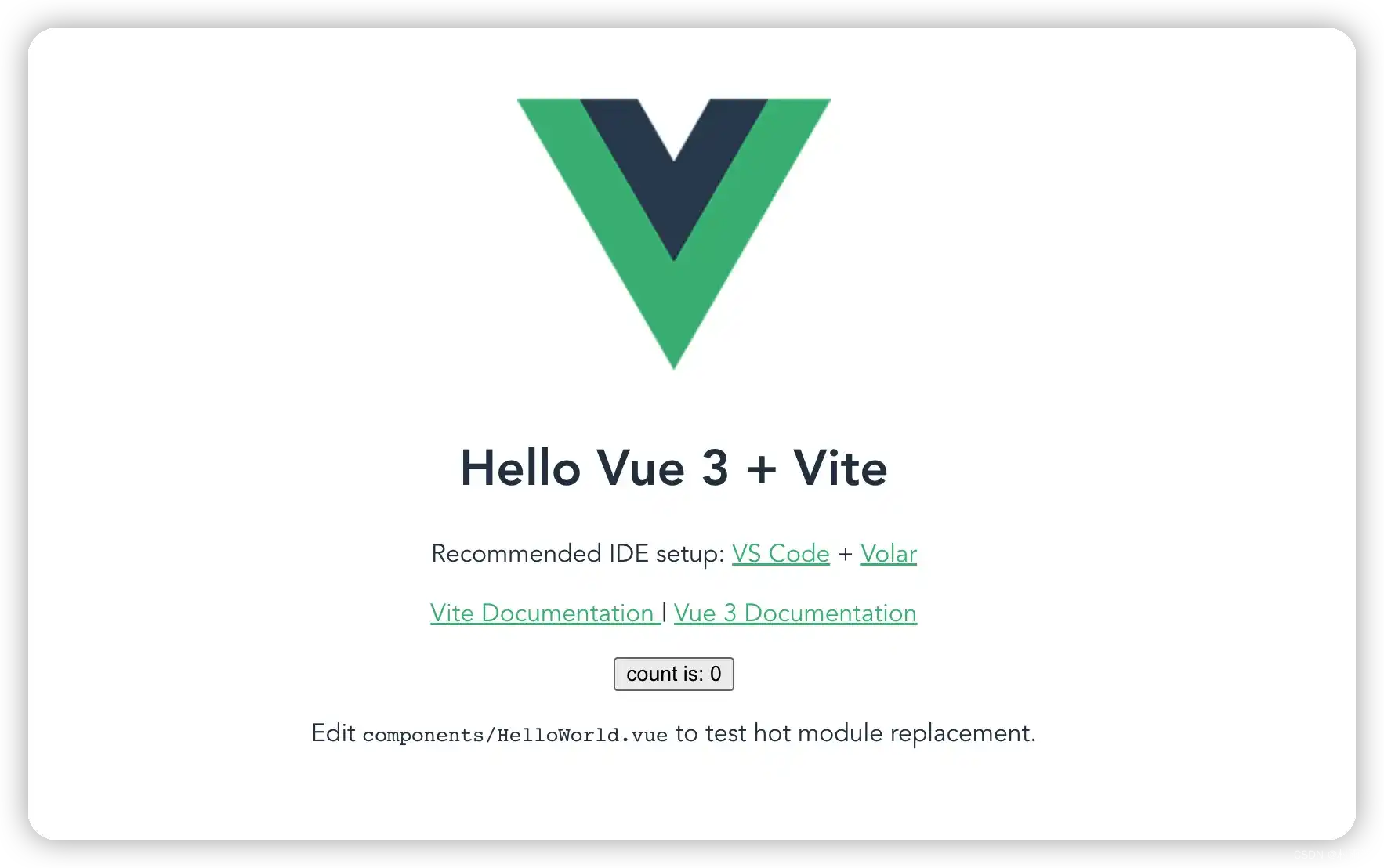 如果一切正常,那么应该就会出现以下的界面了,至此我们的第一个 Vite + Vue 项目就搭建成功了!