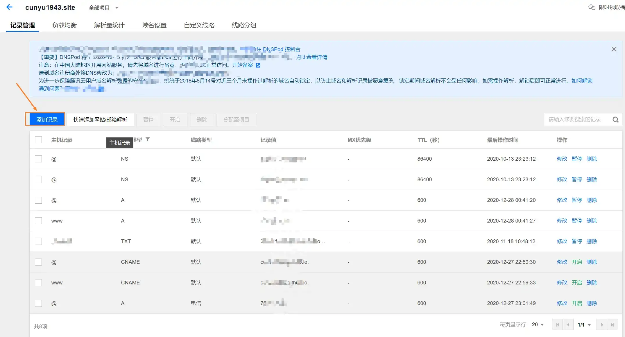- 首先打开 域名解析列表,并点击右侧解析进入解析界面;