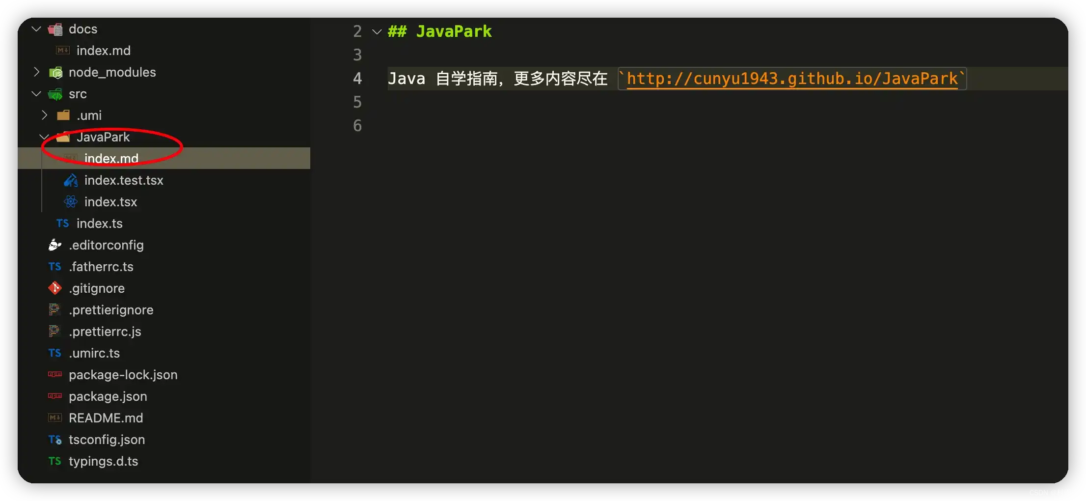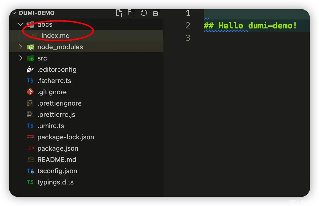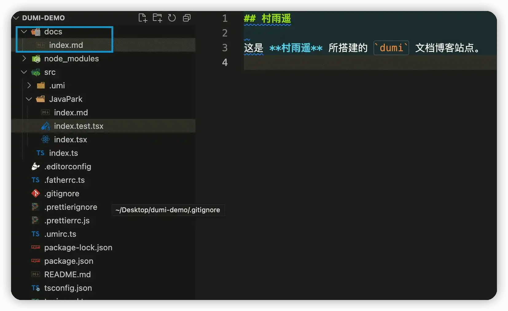 查看我们的项目目录,可以发现 docs 文件,这里就是我们编写文档的地方。项目初始化时,默认只有 index.md 也就是上面我们访问 http://localhost:8080 页面中所称呈现的内容。