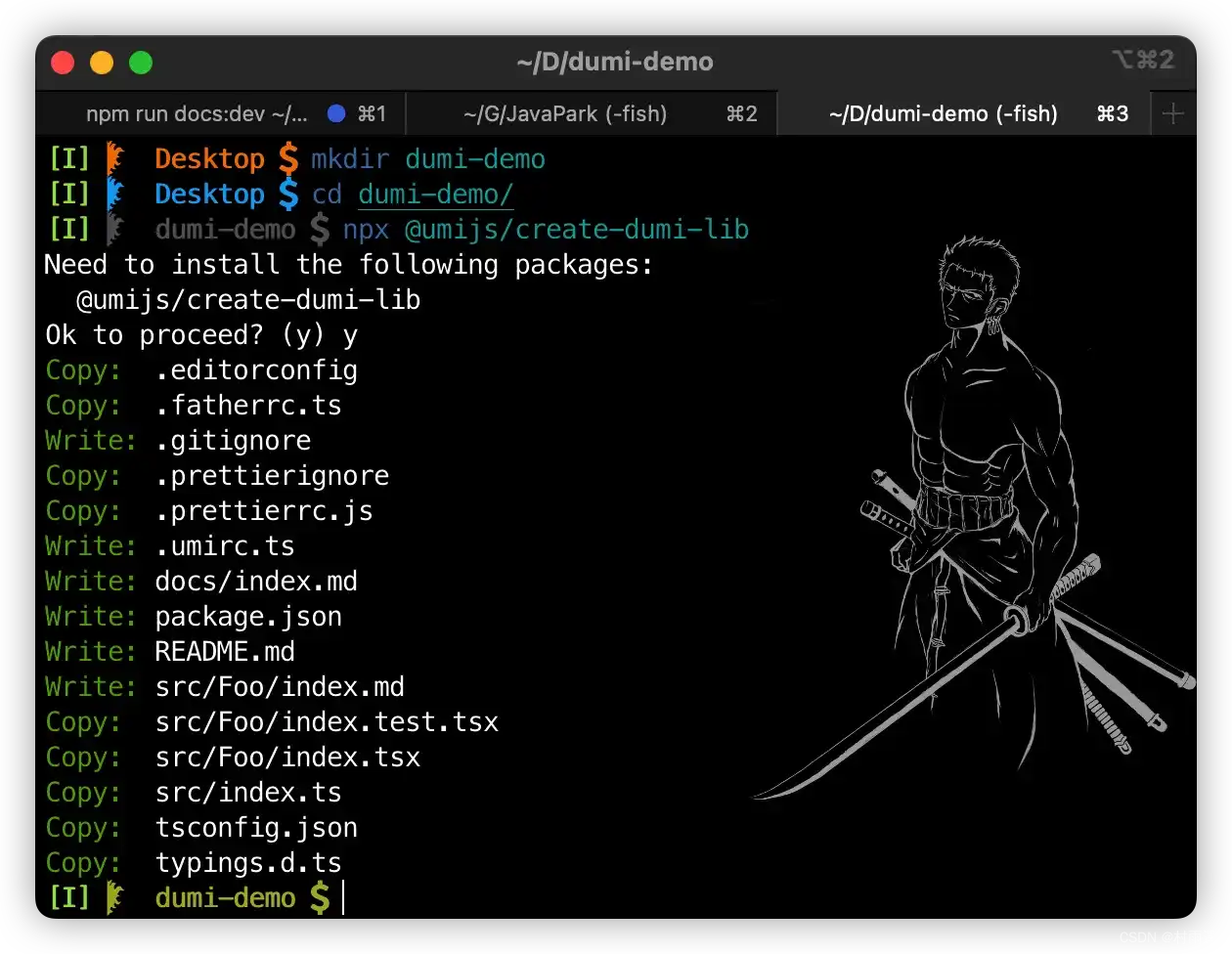 dumi 支持两种初始化脚手架的方式,一种是组件开发脚手架,另一种则是静态站点脚手架,这里主要介绍如何使用组件开发脚手架。