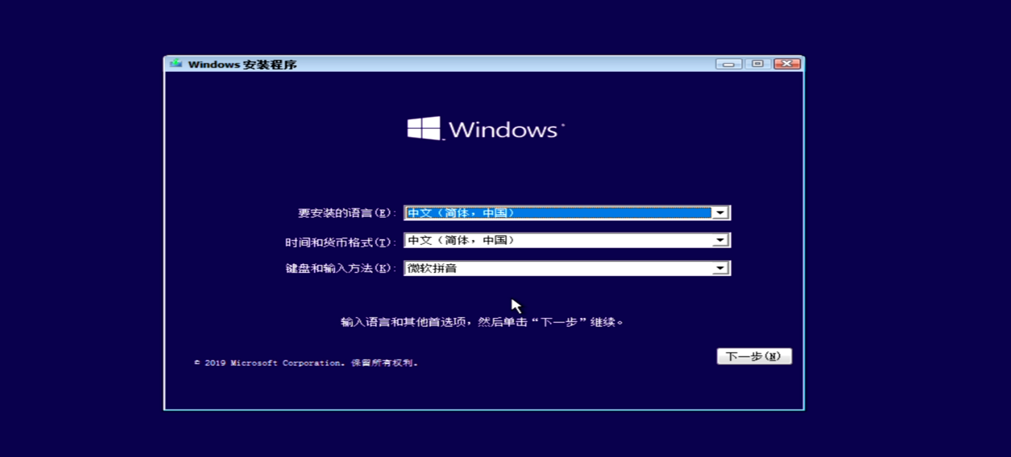 - 设置好 BIOS 启动顺序之后,保存重启等一会儿会自动进入如下主安装界面,根据自己的喜好选择语言,时间格式和键盘输入方式后,点击 下一步;