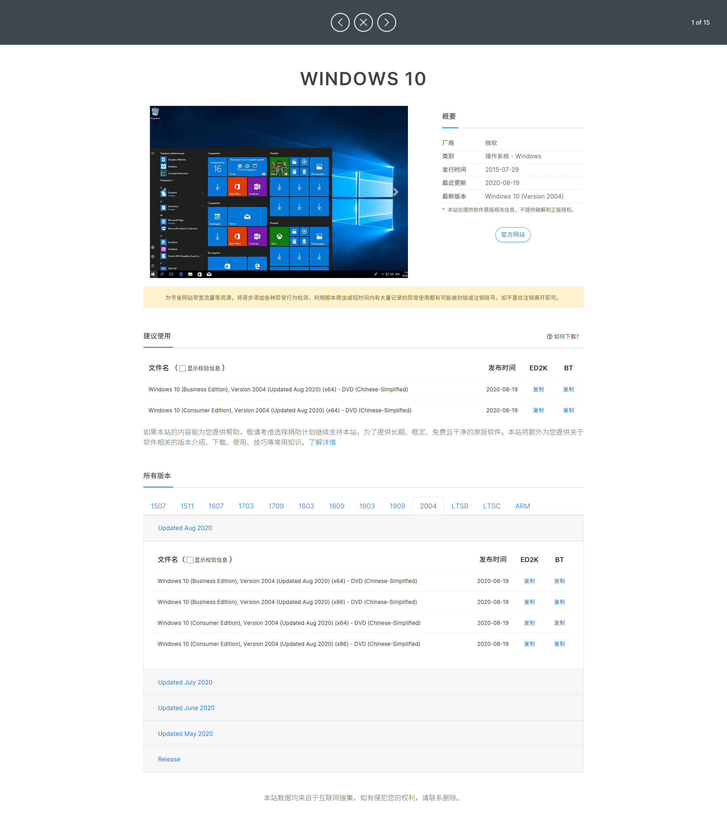 这是一个老牌的 Windows 系统下载的网站,上图是进行改版后的界面,如果你想要访问之前的老版本网站,请移步:https://msdn.itellyou.cn/. 新版本的 MSDN 中,不仅仅提供 Windows 系统的下载,还包括 Linux、MacOS 和 Chromium OS 等系统的下载,比之前所提供下载的系统更丰富了。比如我们选中 Windows 10 的 2004 版后,只要复制 BT 或 ED2K 到相关下载软件(一般是迅雷)中,添加新任务进行下载即可。