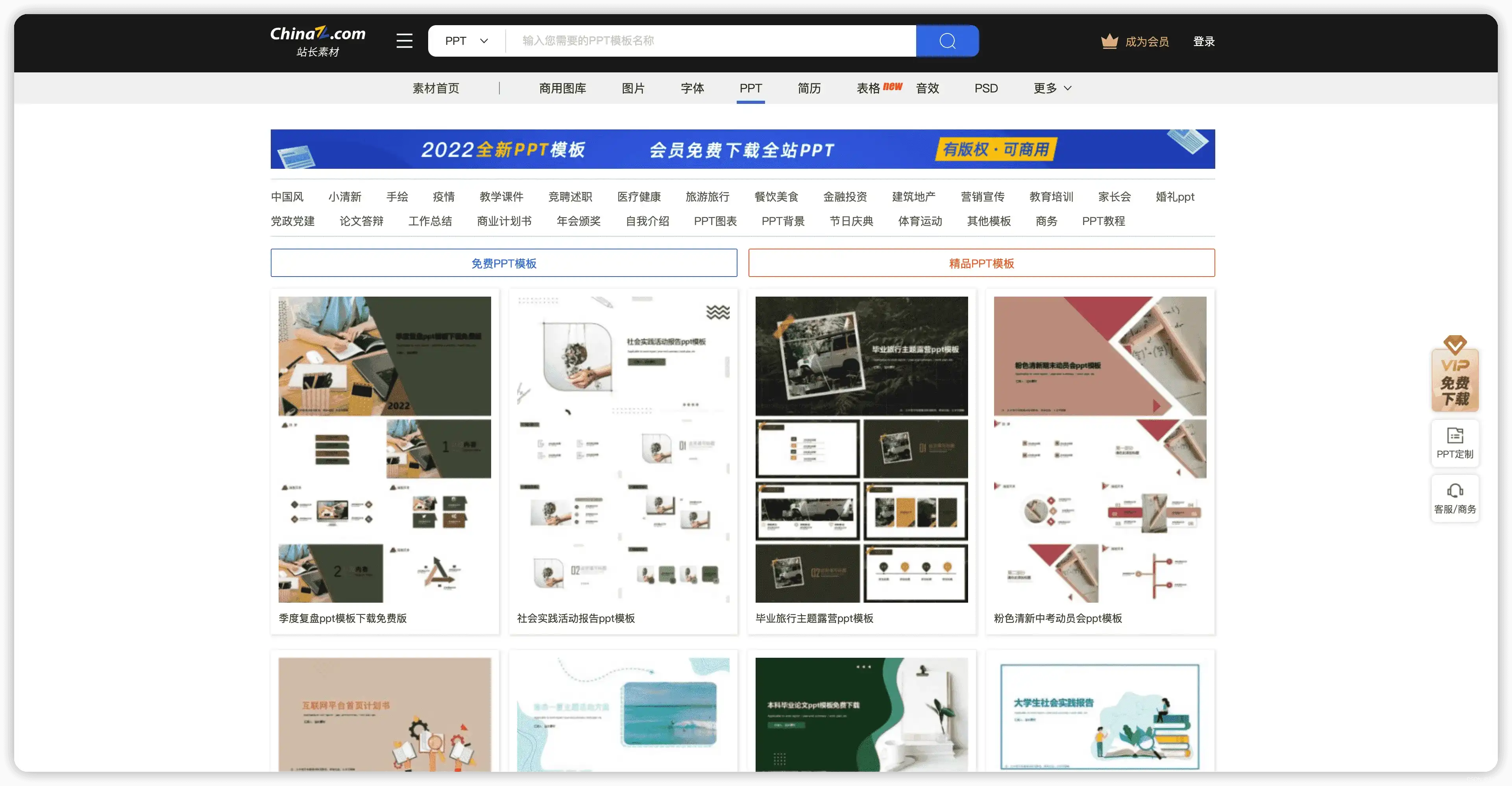 站长之家下的一个子网站,提供各种商用图库、图片、字体、PPT、简历、表格、音效、PSD 等超多资源下载,虽然有的模板需要开通会员才能洗澡,但是免费的就已经很多了,绝对够你用!