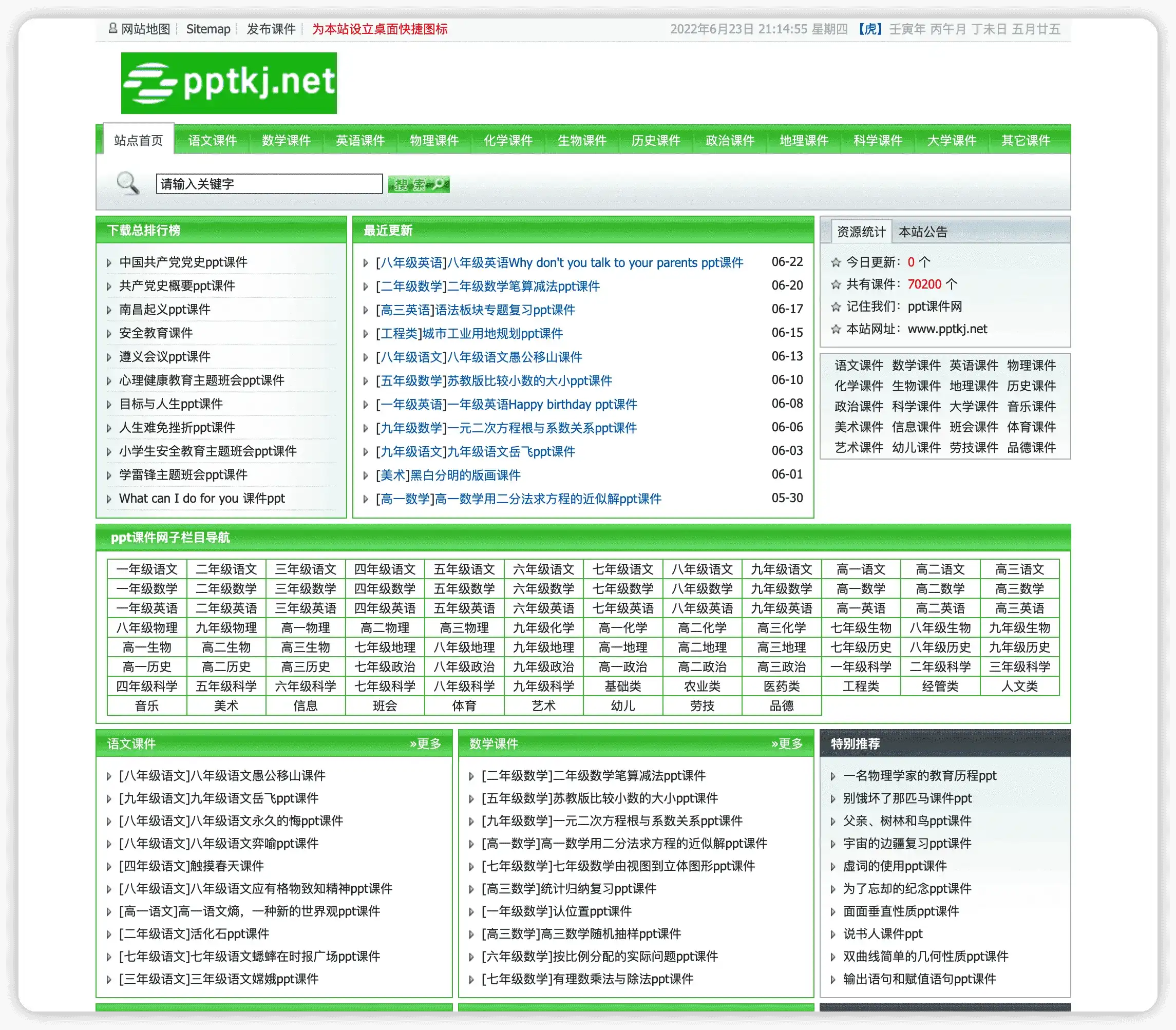 主要提供免费的 PPT 课件下载,这里汇聚了基本上从小学、初中、高中到大学期间所有年级的 PPT 课件,主要包括语文、数学、英语、物理、化学、生物、地理、历史、政治、科学、音乐、美术、信息等科目的 PPT。如果你刚好是一位教育行业从事者,那么相信这个网站一定会对你大有帮助。