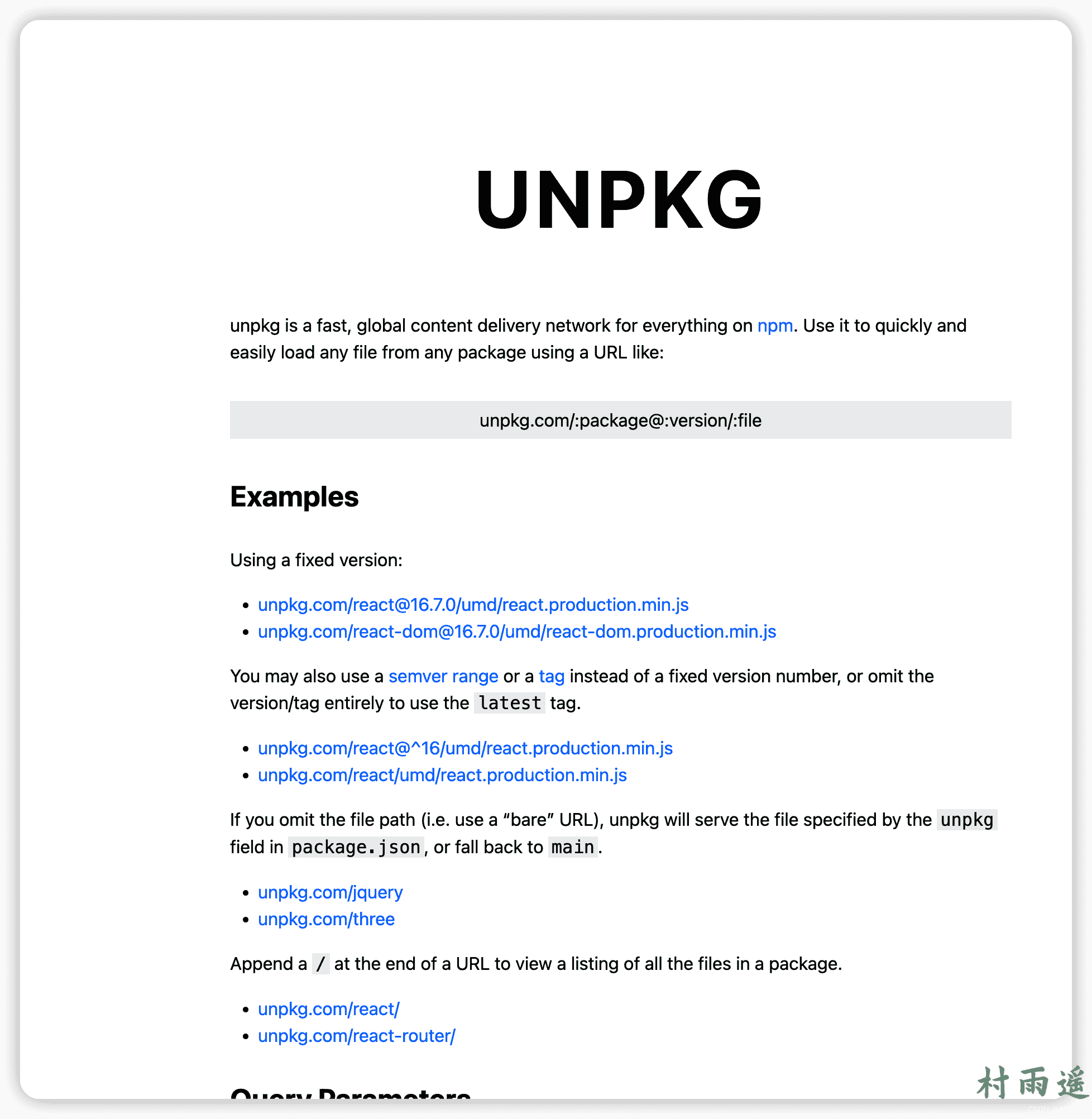 unpkg 是一个快速的全球内容交付网络,适用于 npm 中的所有内容。通过使用它,能够使用以下类似的 URL 就能快速轻松地从任何包加载任何文件!