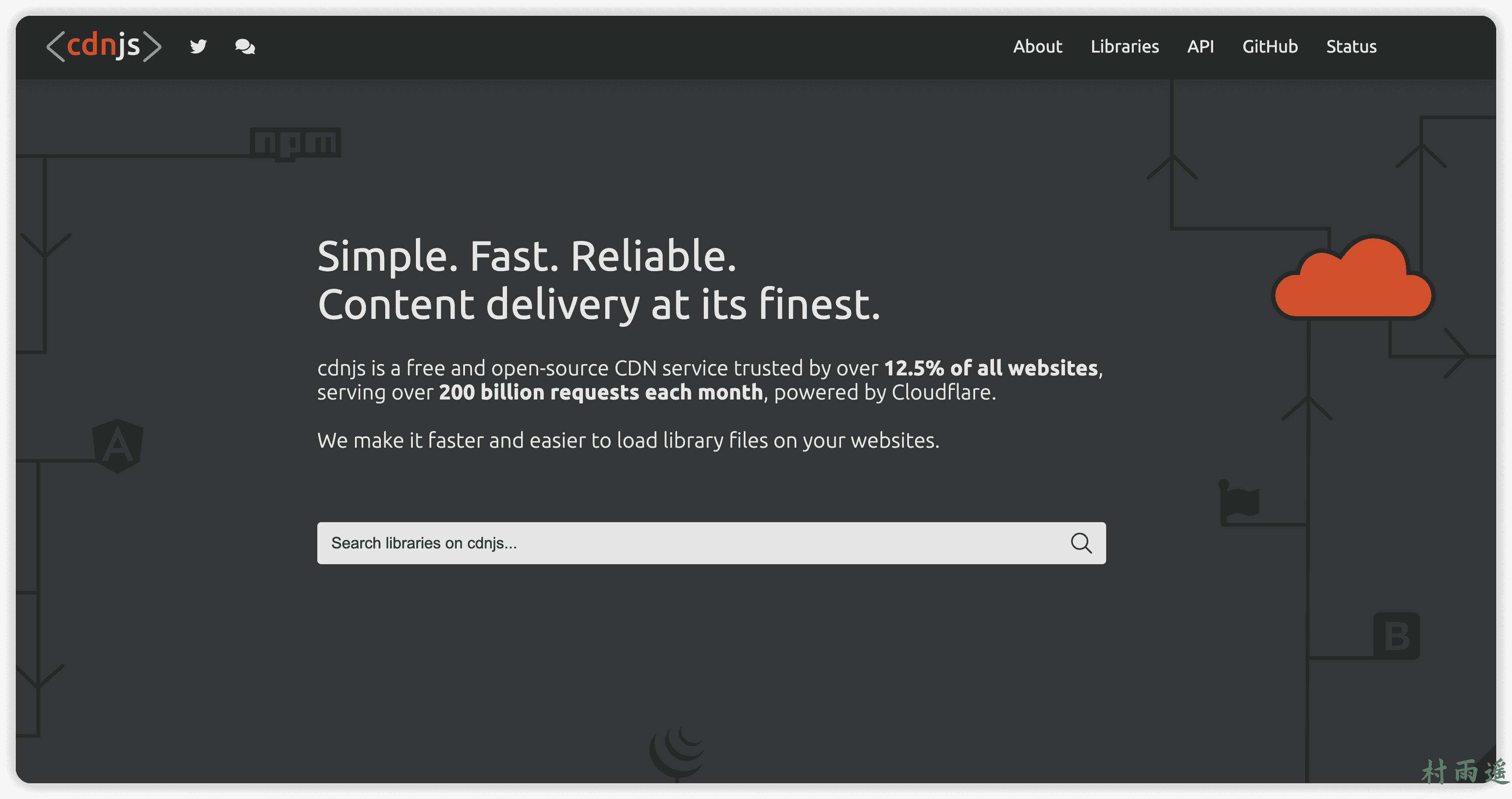 作为全球最为著名的开源 CDN 库,想必每个从事前端的工作的小伙伴都对他有所了解吧。该网站使用 CloudFlare 分发,如果你是在国外使用,那速度没的说,嗖嗖的。不过要是在国内,那还是优先考虑下其他的吧,因为它在国内访问时实在是太慢了!