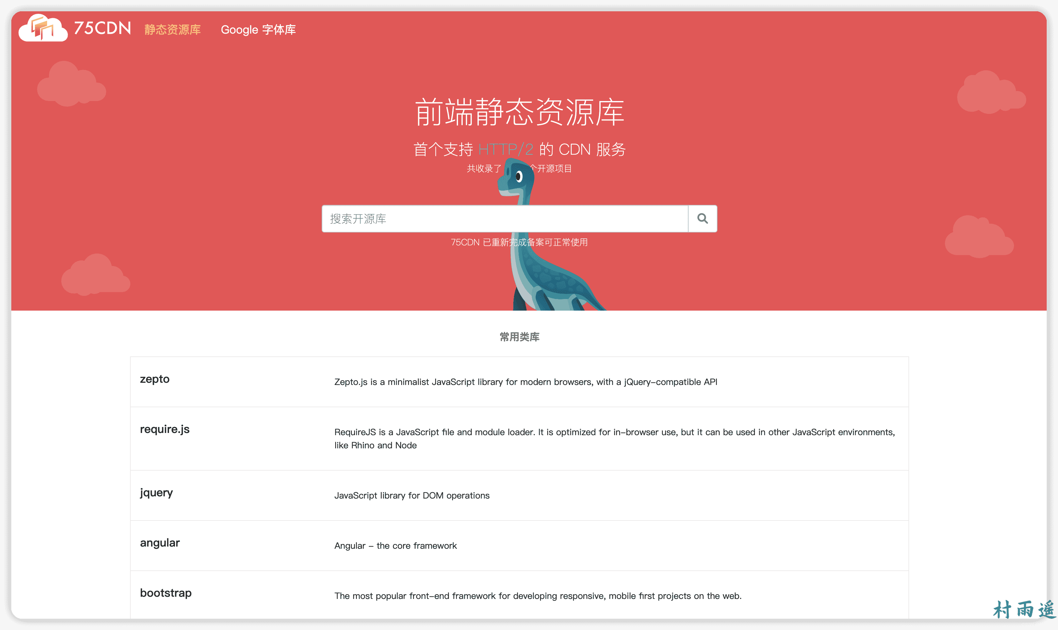 谐音于奇舞,是由 360 前端奇舞团支持并维护的开源项目免费 CDN 服务,支持 HTTPS 和 HTTP/2,囊括了上千个前端资源库和 Google 字体库。而且是首个支持 HTTP/2 的 CDN 服务,共收录了 4275 个开源项目,均同步于 cdnjs!