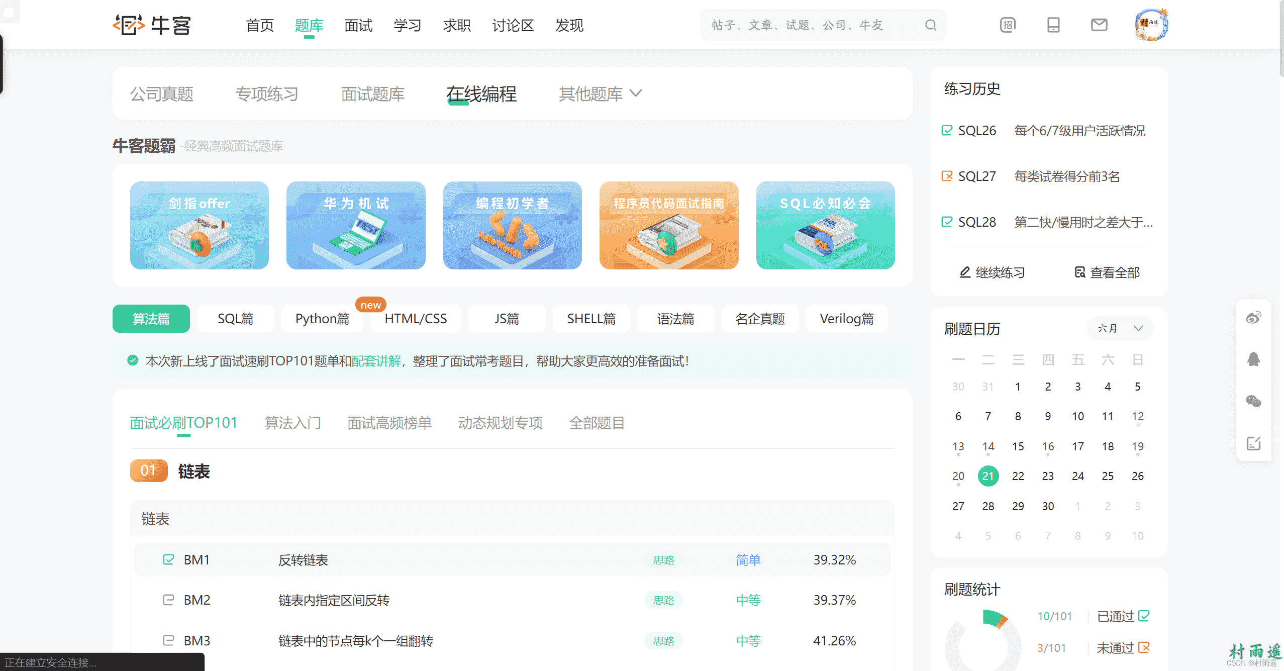 通过在线实操的方式,提升你的编程能力,从而轻松斩获名企 Offer。 这里不仅有实操题目,还有各种精选题目集,更有针对热门编程语言如 Python、Java、SQL 等的学习教程,更有码力评测栏目,快来试试你的码力处于什么段位吧!