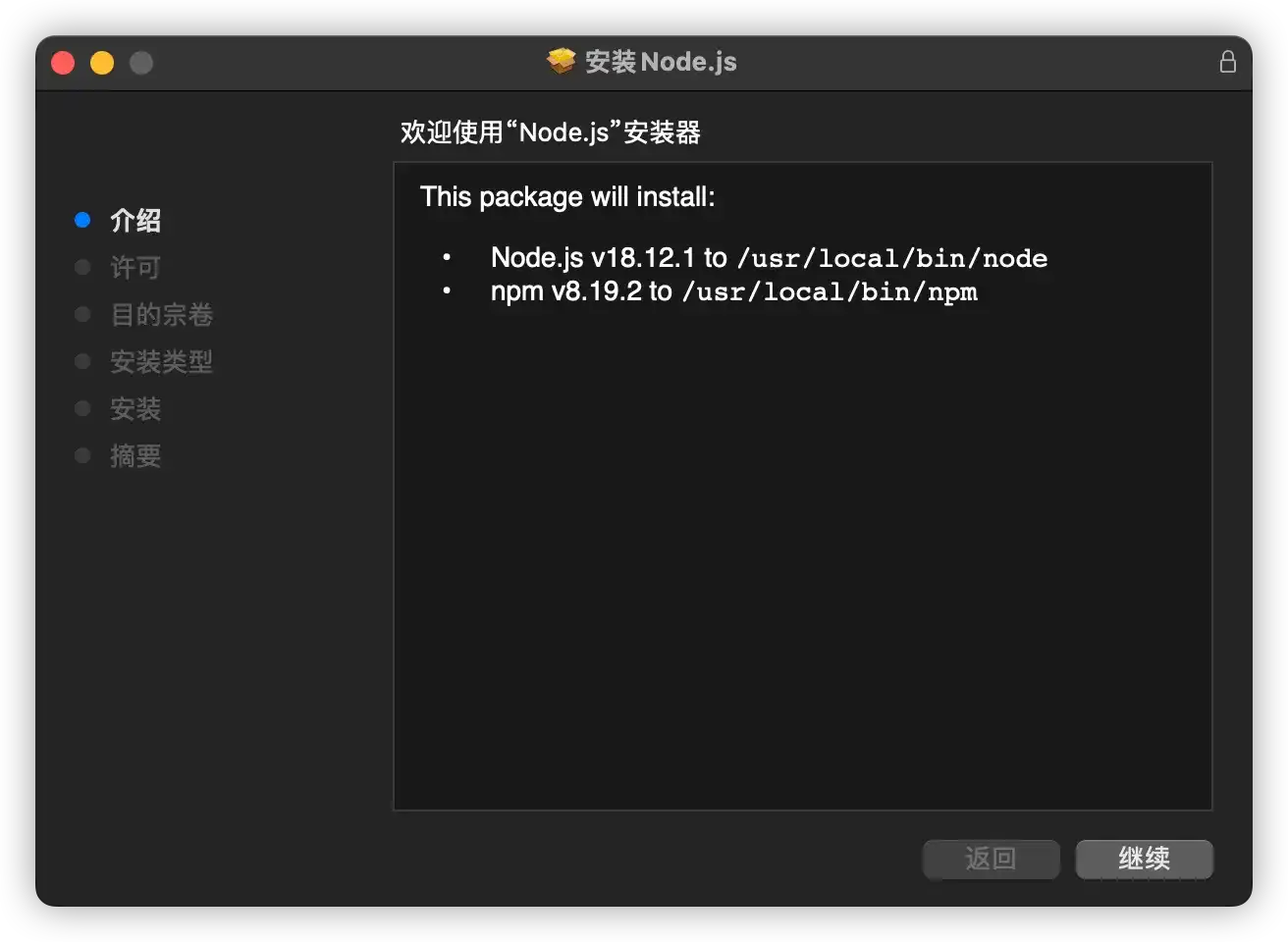 .pkg的安装包,会弹出以下的弹窗。弹窗中会提示欢迎语,然后提示Node.js和npm会安装到硬盘中的地址。