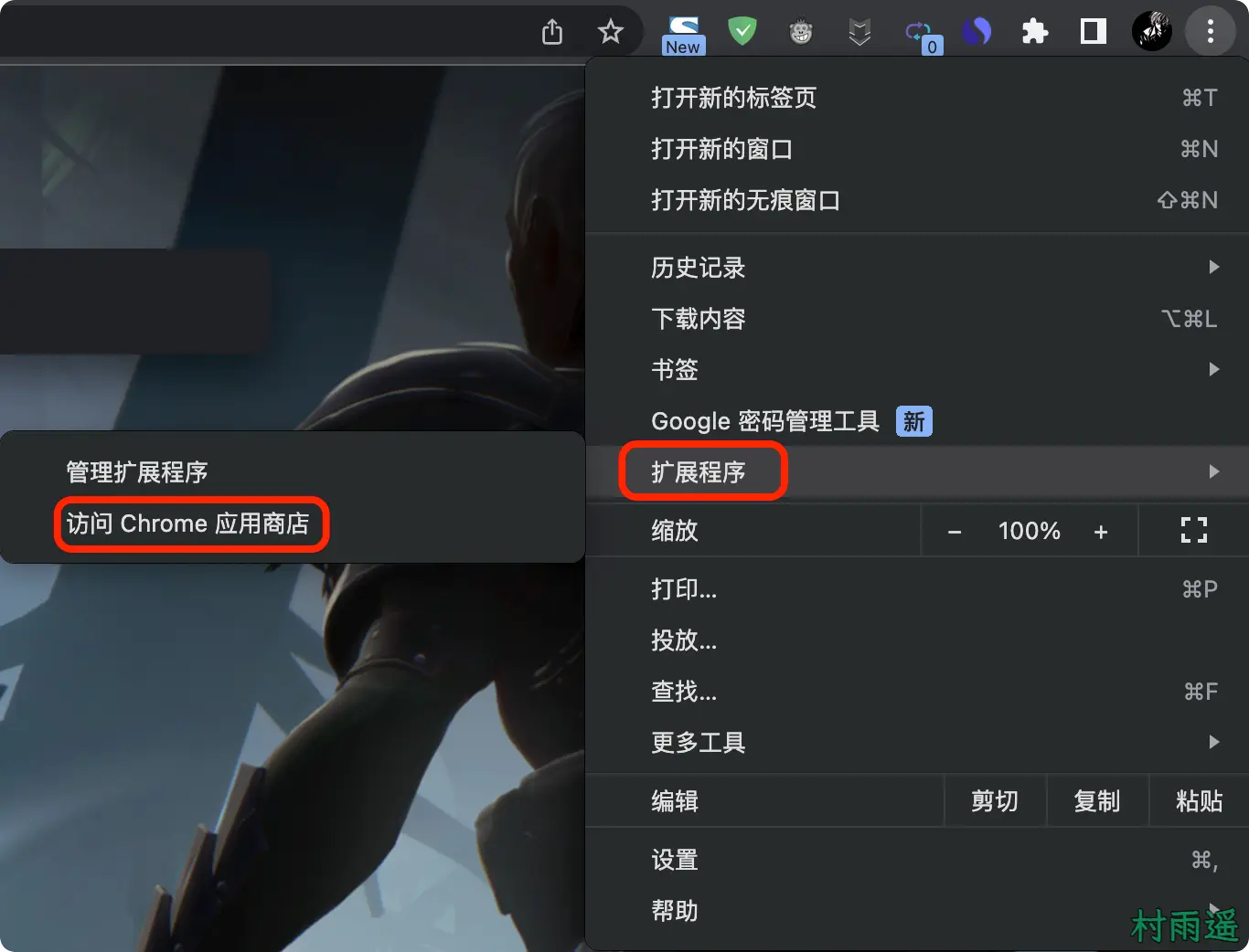 在线安装很简单,只需要打开 Chrome 的在线应用商店,然后挑选你想要安装的插件即可。打开在线应用商店的方式也很简单,入口在浏览器登录后的头像右边菜单栏中的的扩展程序 -> 访问 Chrome 应用商店。