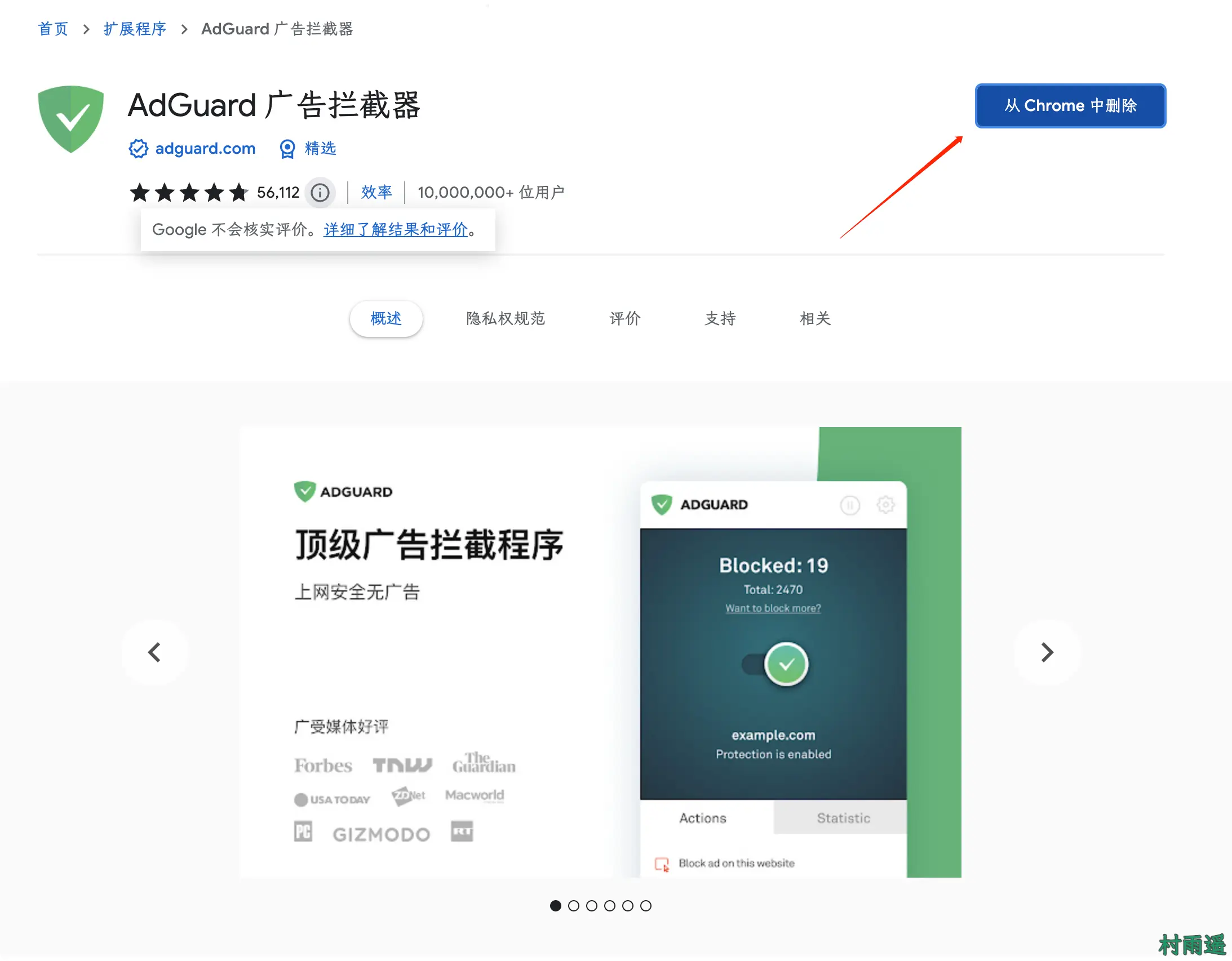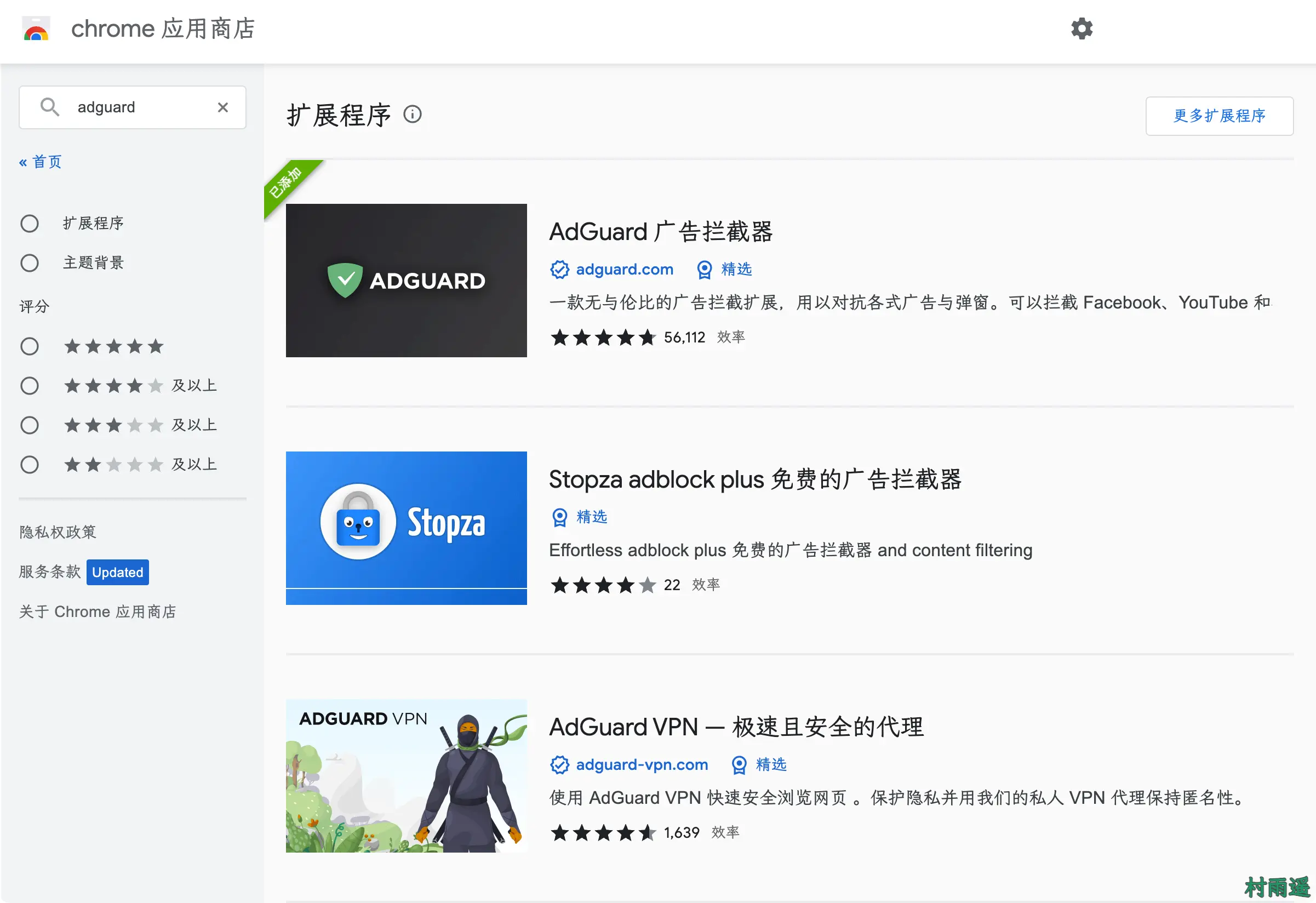 打开在线商店之后,我们就可以挑选自己想要安装的插件了。比如我这里以 AdGuard 为例: