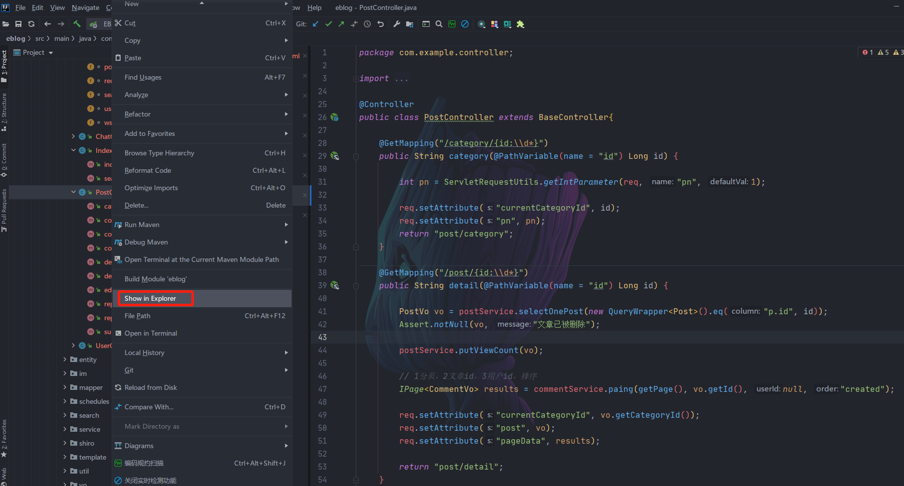 要打开文件所在文件夹,一般是通过选中文件,然后鼠标右键选中 Show in Explorer 即可;