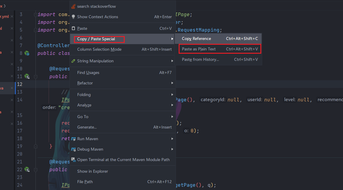 同时,在 IDEA 中,默认粘贴时是会对代码自动格式化的。如果我们不想让它自动格式化,那么此时可以利用快捷键 Ctrl + Alt + Shift + V 进行粘贴。或者通过右键菜单,选择 Paste as Plain Text 进行粘贴;
