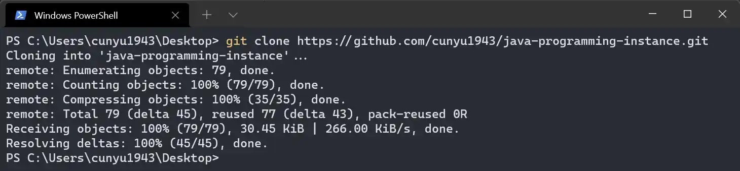 git clone Githu 仓库地址git clone https://github.com/cunyu1943/java-programming-instance.git