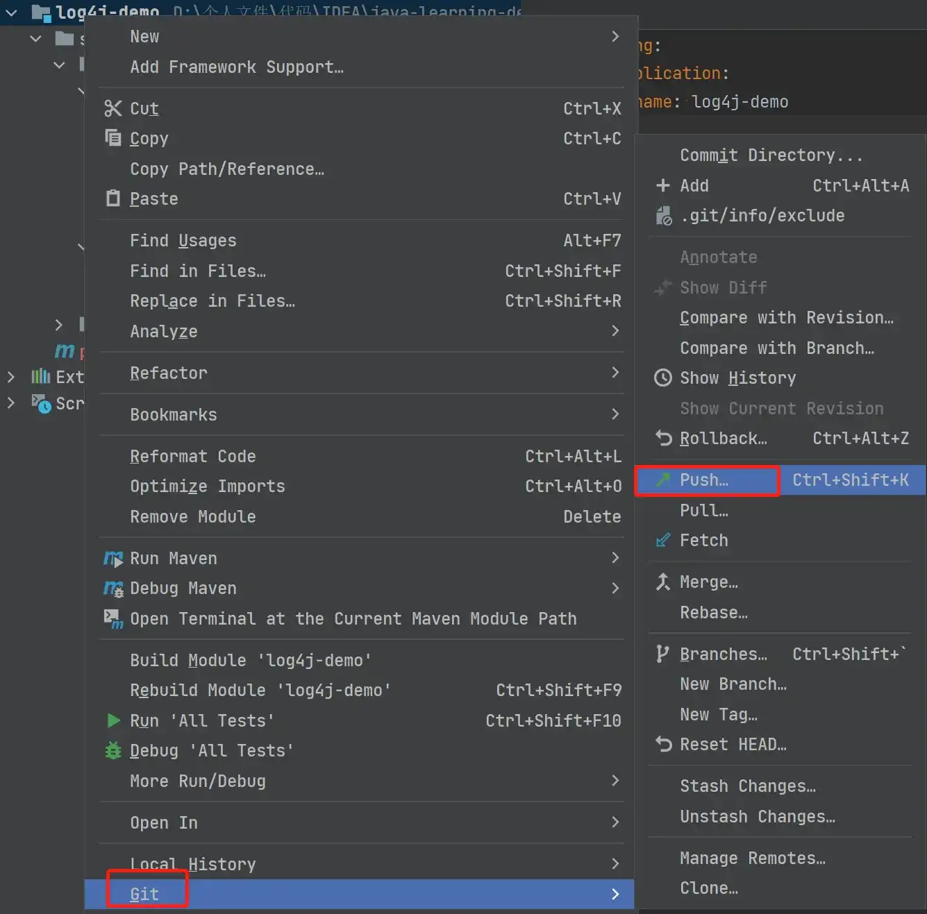 通过在项目上点击鼠标右键,然后选择 Git -> Push,同样可以进行我们的推送工作。