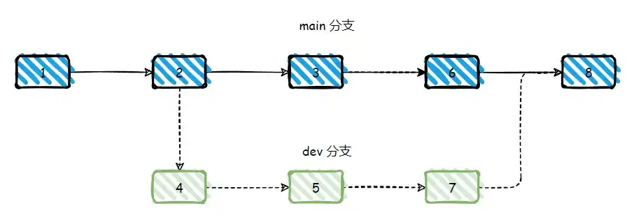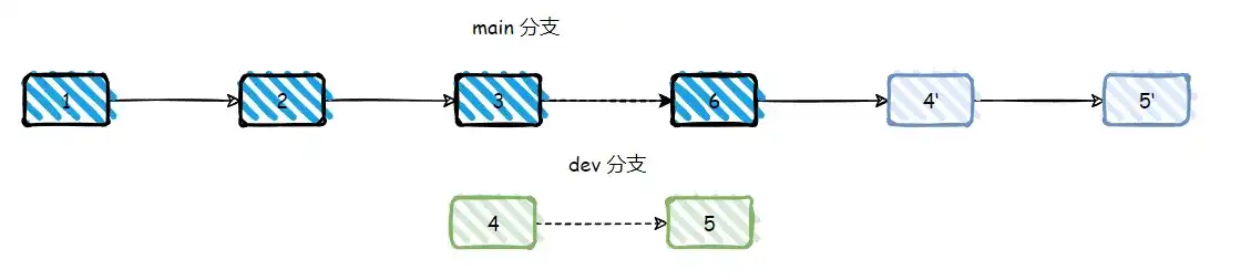 Rebase 则是重新基于一个分支进行 commit,即将当前分支从祖先的 commit 后所提交的 commit 均撤销,将他们放到一个缓存中,然后基于一个分支的后面,将缓存的 commit 按照顺序以一个个新增到该分支后面,用图表示如下,将 4 和 5 所提交的 commit 放到缓存中,然后按顺序将其新增到 6 的后面。