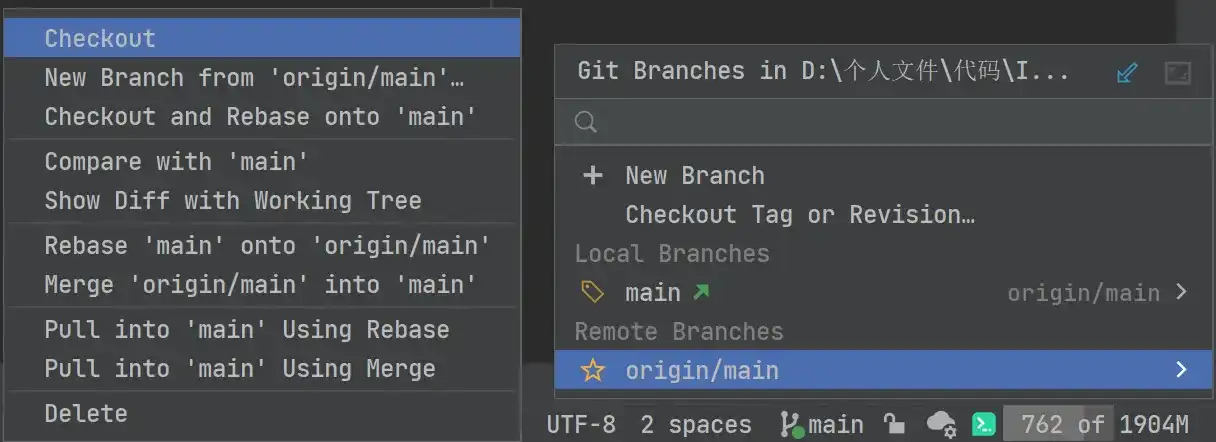 此时就需要关注下 IDEA 底部的状态栏了,在这里我们不仅可以切换不同分支,还能进行新建分支、Checkout 分支代码、Compare 分支代码、Rebase、Merge、Pull 等一系列操作。