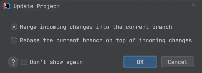 更新时有两种方式,一种是 Merge incoming changes into the current brance,而另一种则是 Rebase the current branch on top of incoming changes。
