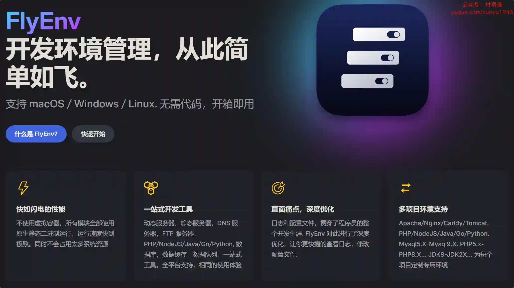 一款专为现代开发人员设计的一体化环境管理工具。它通过提供快速的多版本切换、全栈技术支持和无缝的跨平台体验来简化开发。无论您使用的是 PHP、NodeJS、Java、Go 还是 Python,FlyEnv 都可以通过一个命令集成所有必要的工具,消除配置难题。