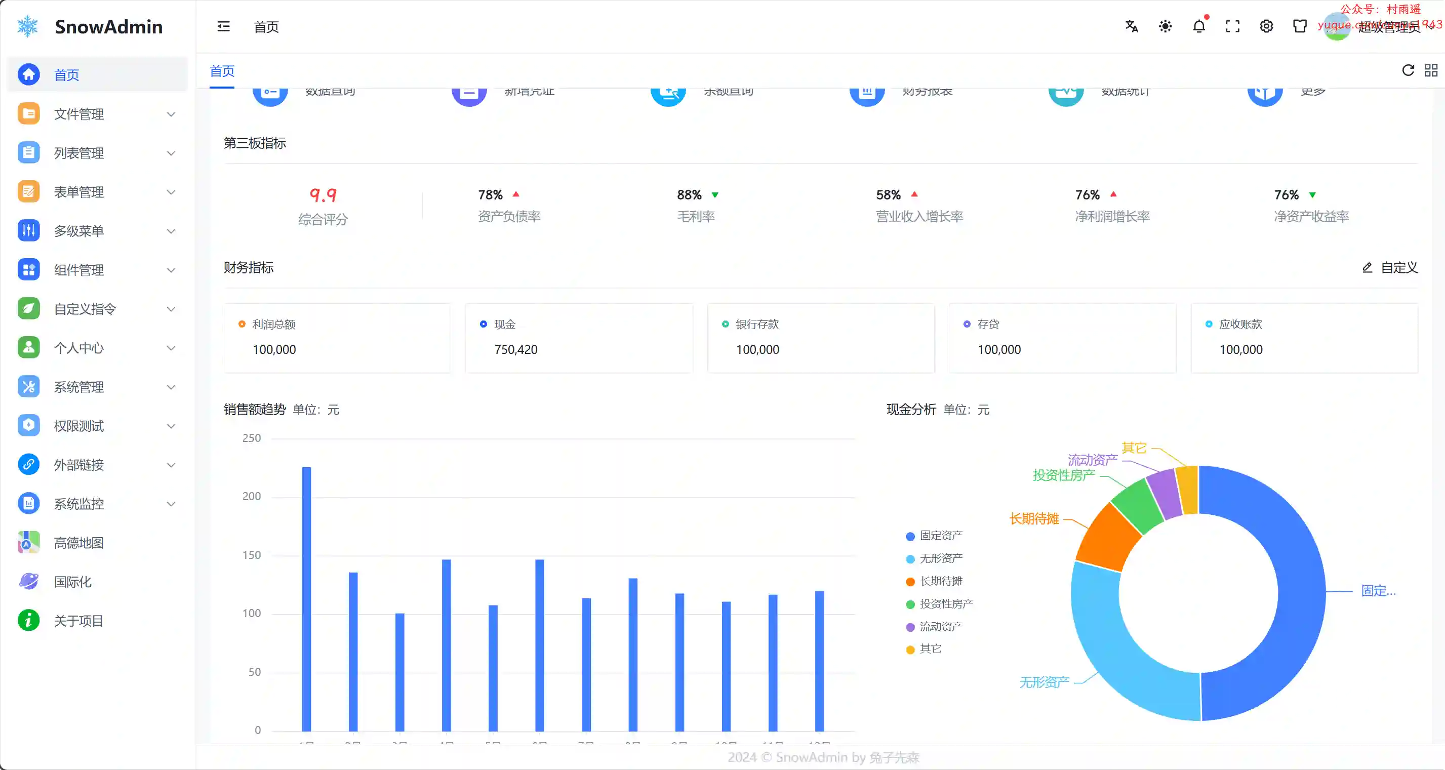 一个清新优雅、高颜值且功能强大的后台管理模板,基于最新的前端技术栈,包括 Vue3, Vite5, TypeScript, Pinia。它内置了丰富的主题配置和组件,代码规范严谨,实现了自动化的文件路由系统。SnowAdmin 提供了一站式的后台管理解决方案,无需额外配置,开箱即用。