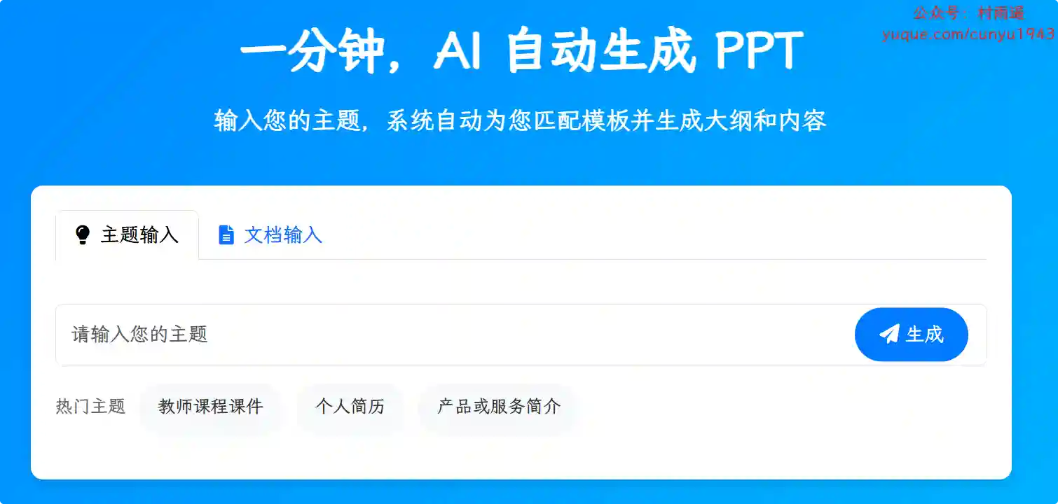 一个 AI 在线智能生成 PPT 的平台,主要功能包括:AI 智能写 PPT,PPT 在线编辑、修改和导出,提供根据主题,文档,文本等多种方式生成ppt。