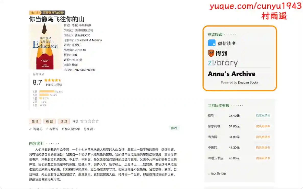 在豆瓣读书页面显示多个在线资源的链接,看到好书,想读就读,一键即达。
