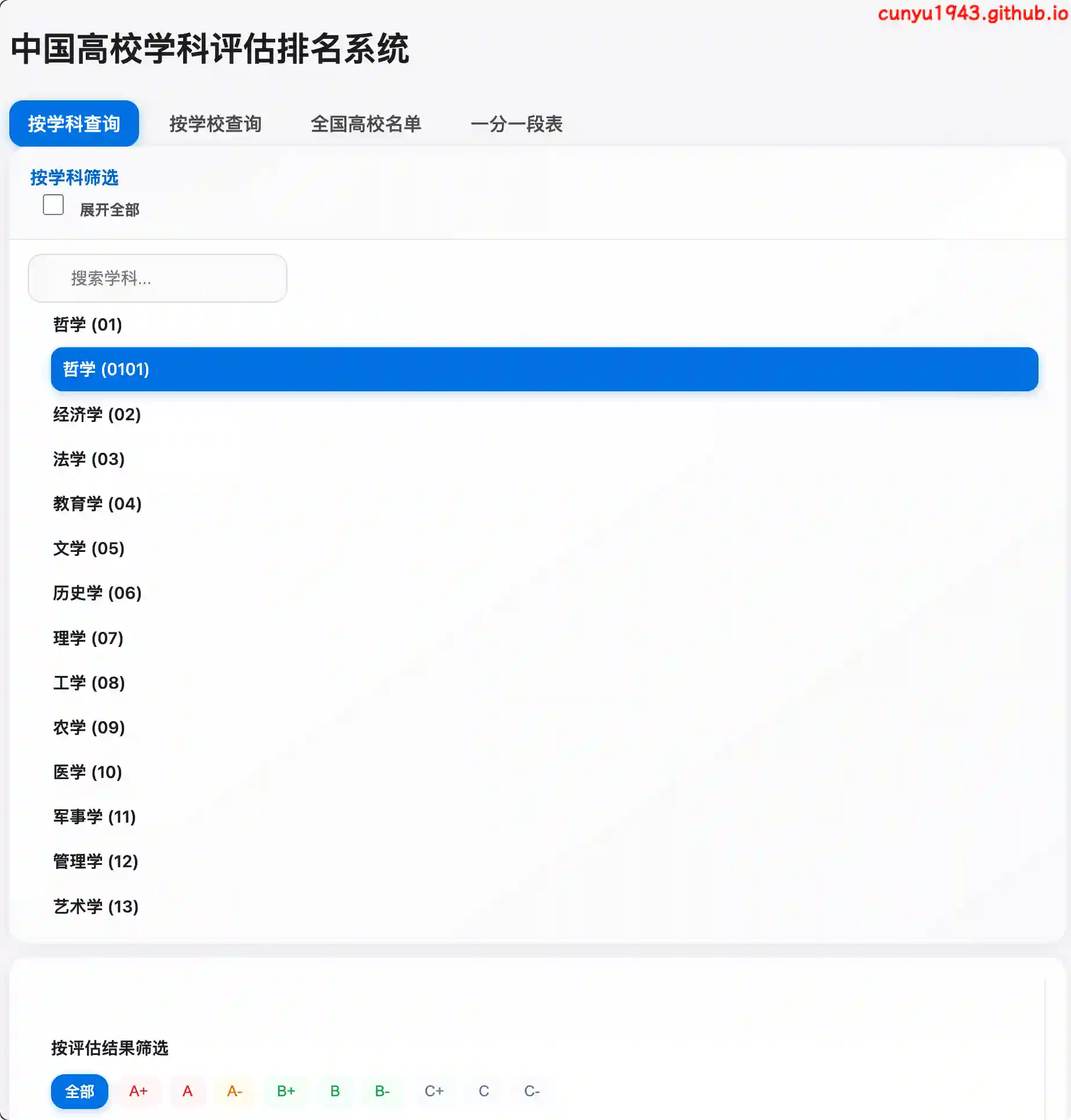 提供最新第四轮学科评估数据,覆盖哲学、经济学、法学等门类。按学科查询高校排名,找到 A+、A、B+ 等评级的高校和专业。