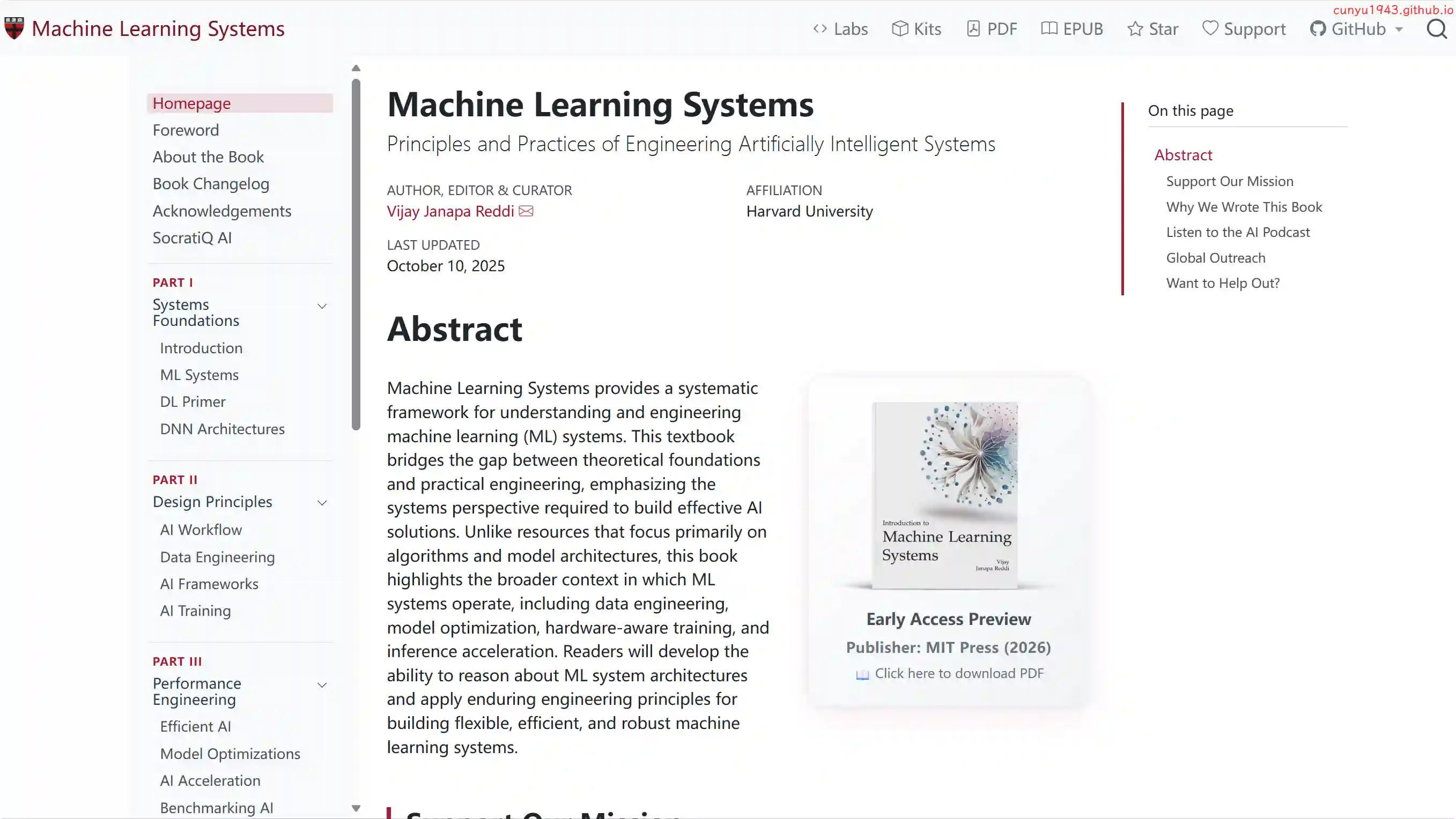 开源机器学习系统入门数据,最初在哈佛大学的 CS249r 课程中使用,现在被许多大学当做教材。