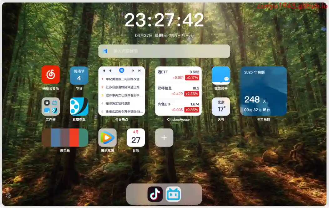 一款多功能的新标签页插件,让你自由打造高颜值主页,丰富多彩的小组件可供选择、精美的界面和便捷的功能体验。采用 iOS 风格的小组件卡片设计,内置 ChickenHouse、 节日、天气、热搜等实用功能,让信息一目了然,标签页整洁美观。