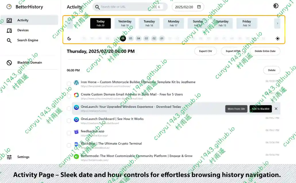 简洁的历史记录管理器:强大的搜索、批量导出、删除自定义选择、按日和小时筛选,以及从历史记录中阻止特定域名。
