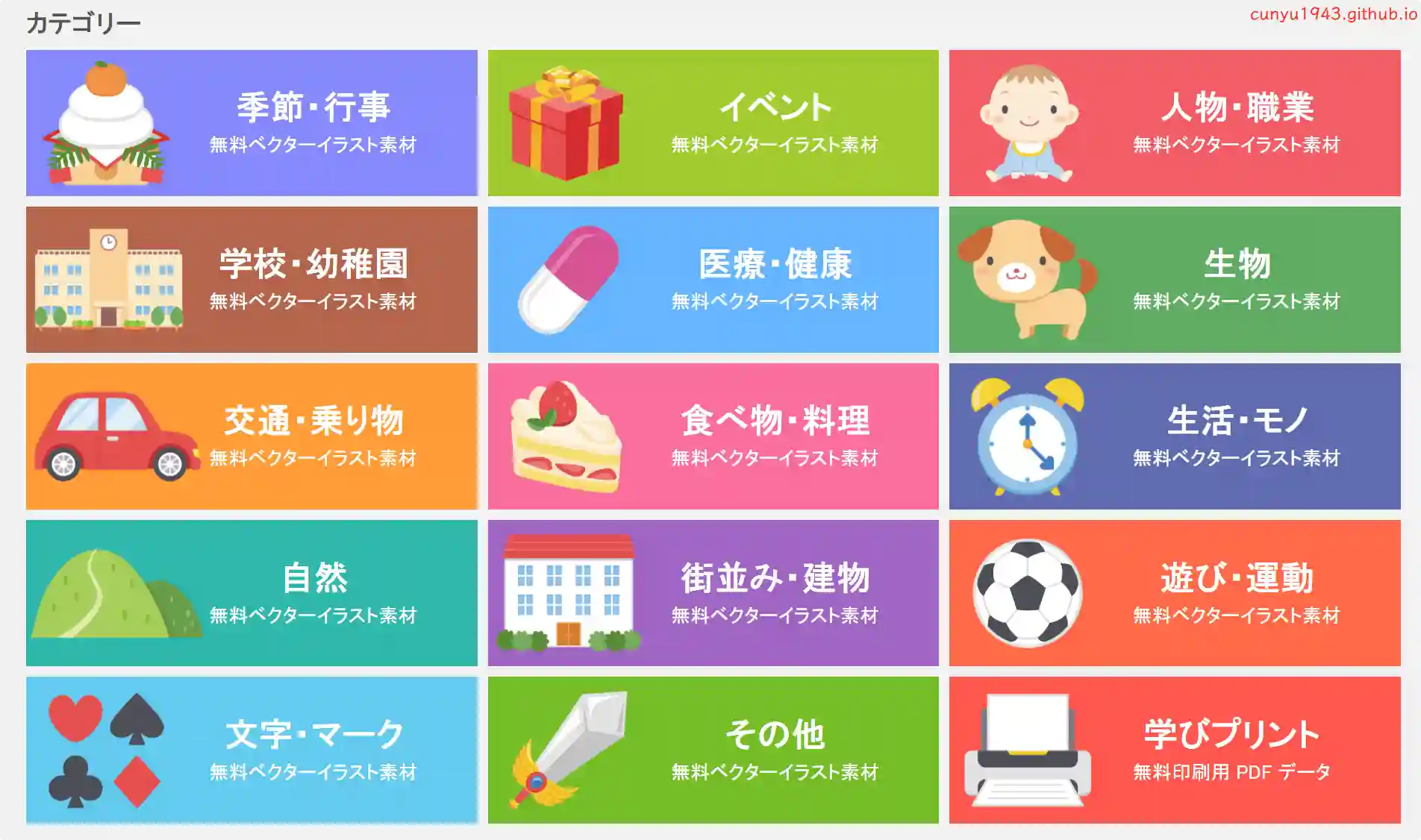 来自日本的插图素材网站,提供各种免费可爱的向量插图,涵盖季节、学校、人物、运动、医疗、动物、食物、交通、建筑物等共 15 种类别。