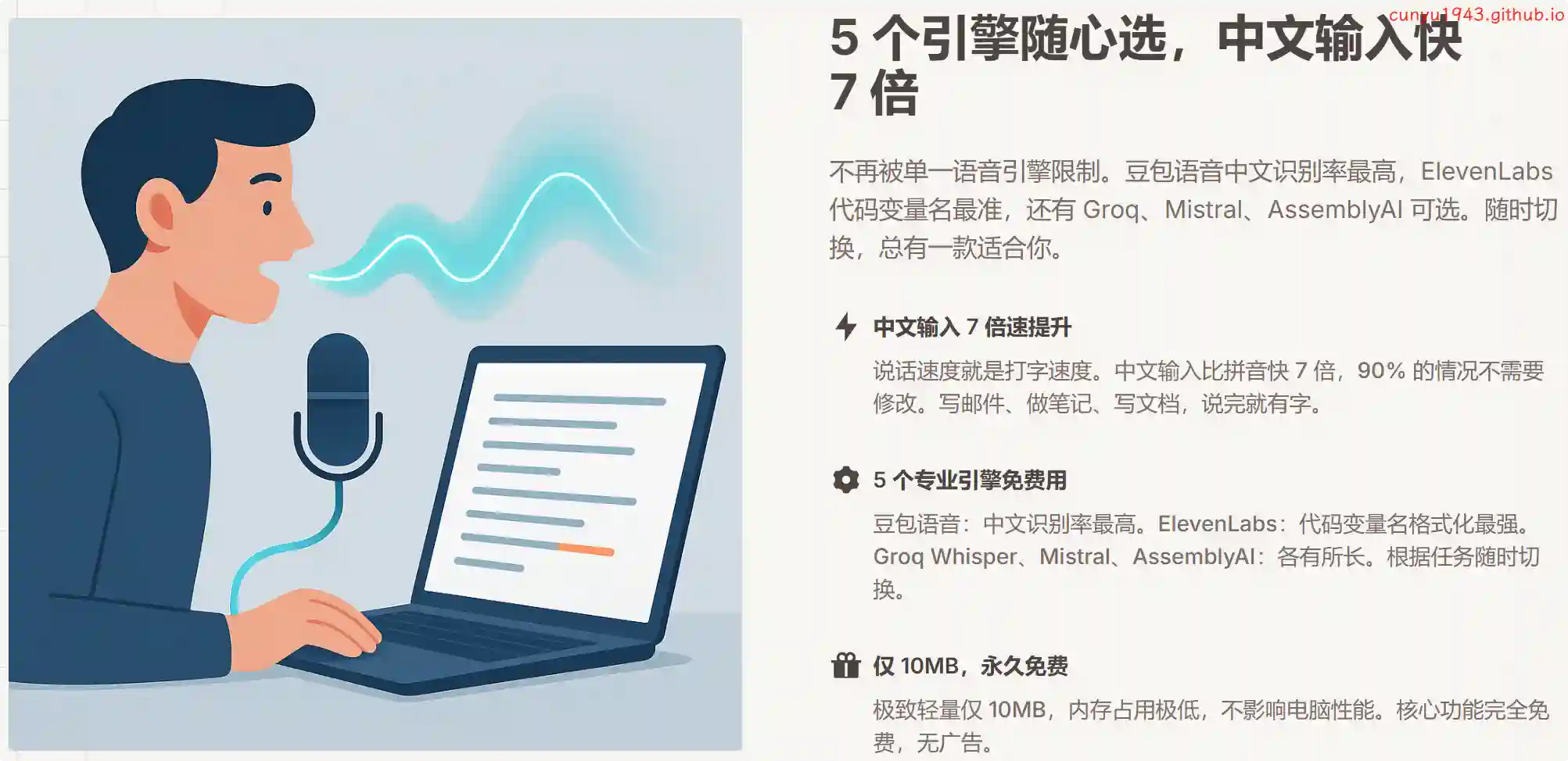 告别手动输入的繁琐!这是一款基于 Whisper 的免费语音输入应用,准确率高达 90%,速度超快且体积小巧。它完美支持中英日韩等多语言无缝混合输入,让沟通更高效。立即体验未来输入方式!