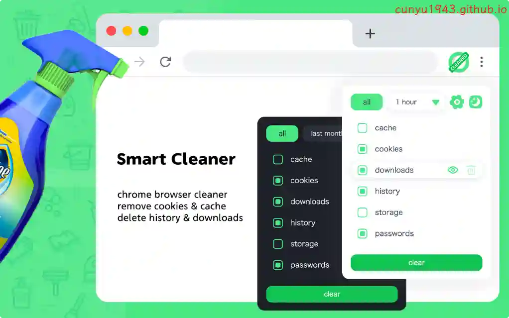 一个有用的浏览器扩展,可以帮助您快速清理浏览器。有助于删除您的在线活动的所有痕迹,以保护您的隐私。