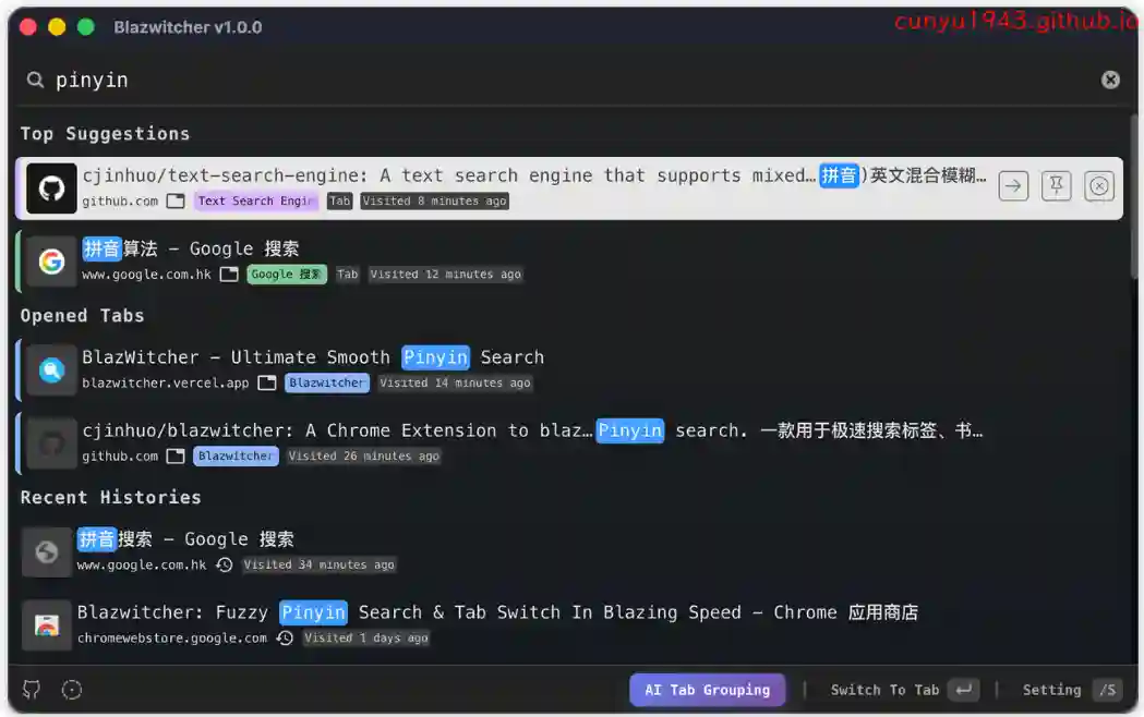 一个用于搜索标签,书签和历史,支持模糊拼音搜索和 AI 标签分组。对于那些打开多个选项卡并希望切换正确的选项卡或从历史记录或书签中快速创建新选项卡而不想通过手动寻找的人来说,这也是一个完美的解决方案。