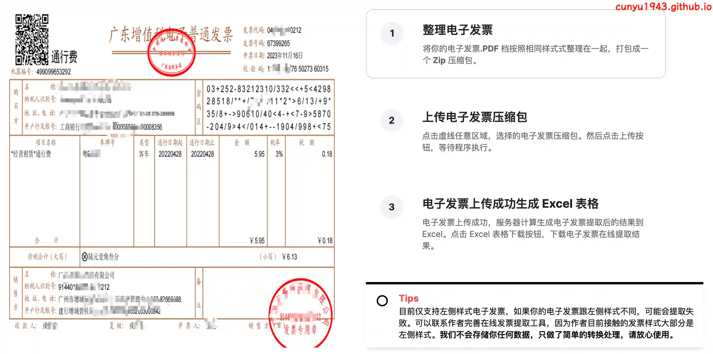 在线的免费的发票提取工具,支持电子发票一键批量提取到 Excel 表中。