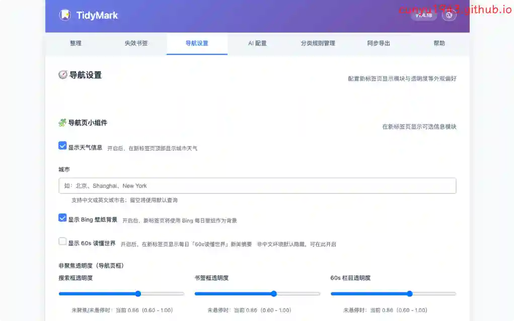 一款轻量的书签整理与新标签页扩展,支持自动分类、AI 辅助、失效书签检测与导航。