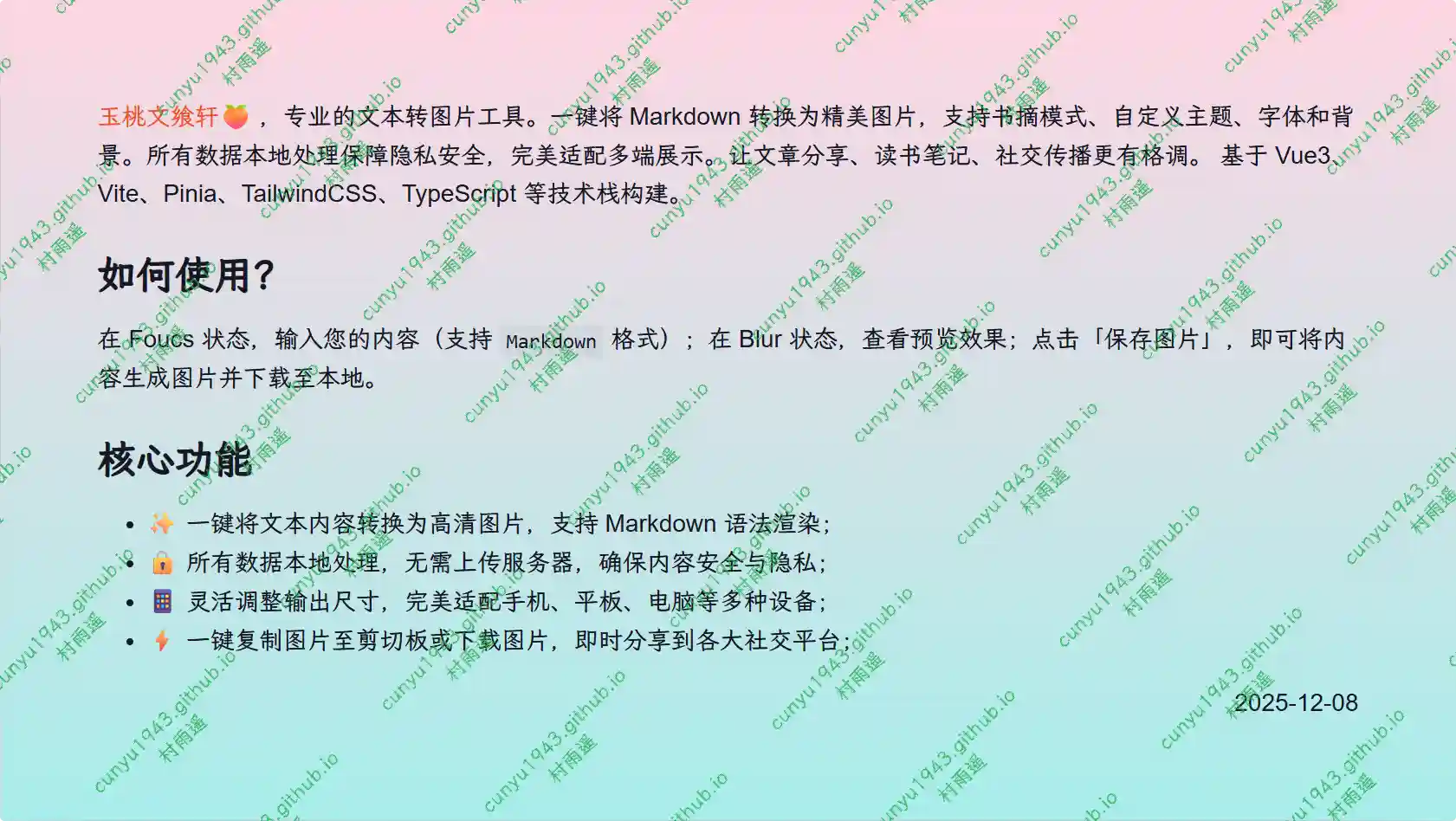 专业的文本转图片工具。一键将 Markdown 转换为精美图片,支持书摘模式、自定义主题、字体和背景。所有数据本地处理保障隐私安全,完美适配多端展示。让文章分享、读书笔记、社交传播更有格调。 基于 Vue3、Vite、Pinia、TailwindCSS、TypeScript 等技术栈构建。